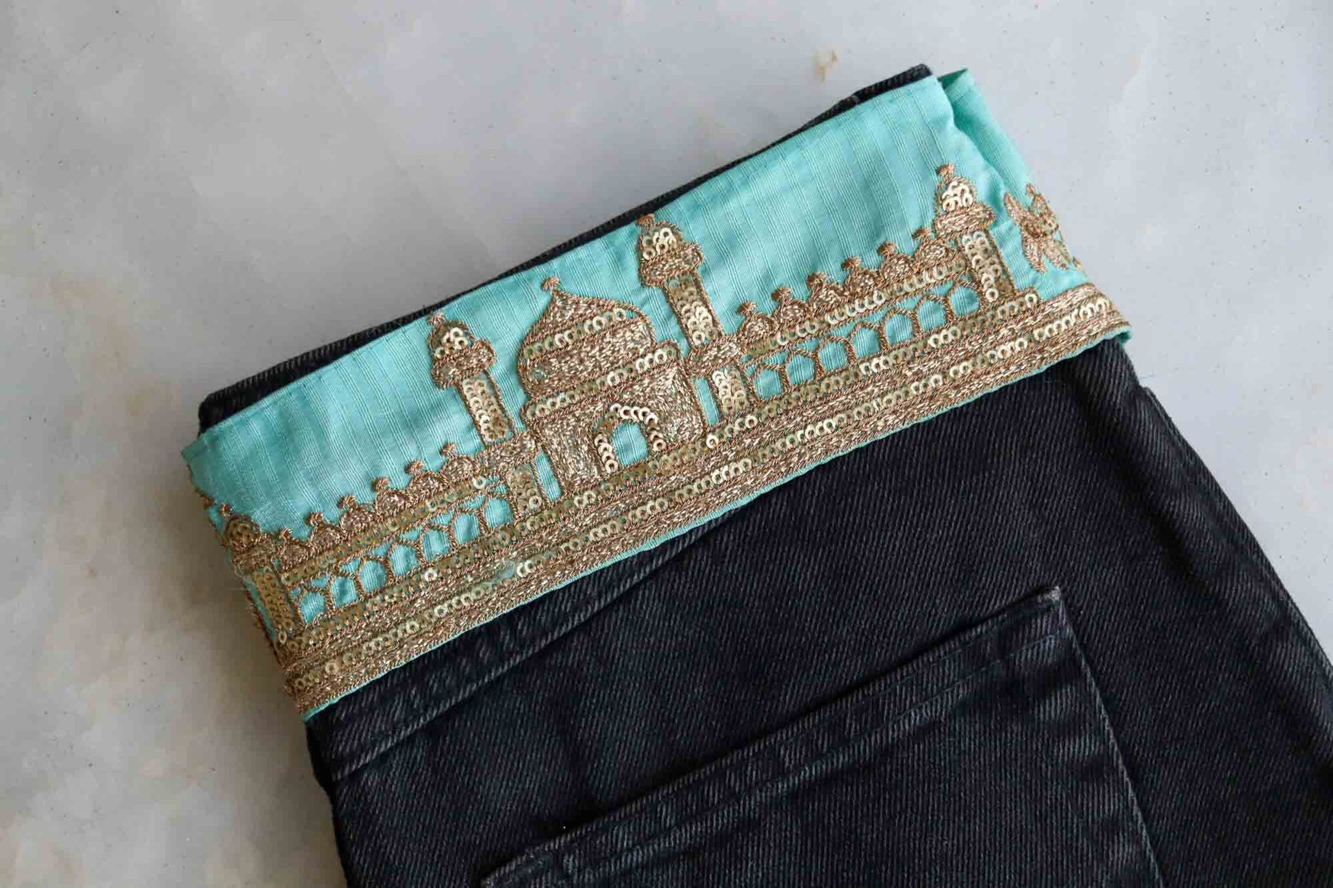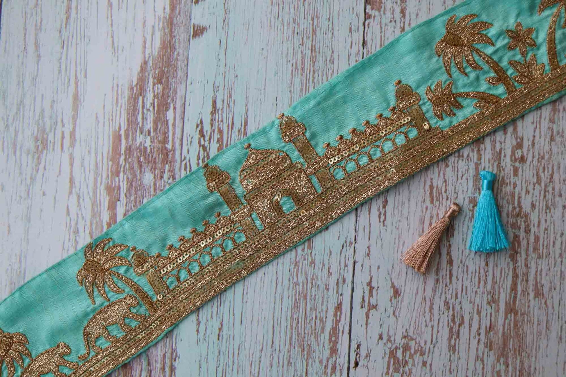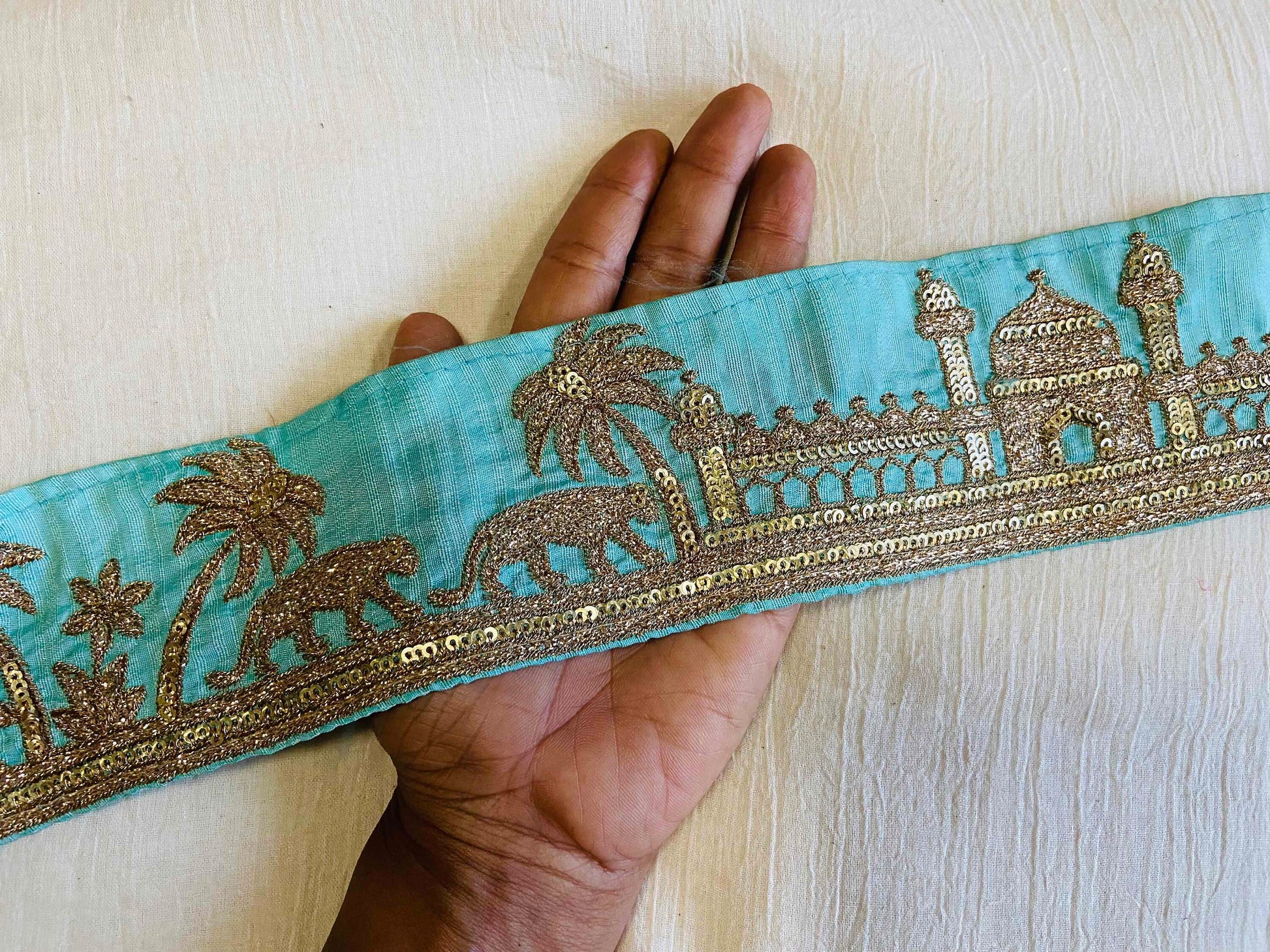 A unique collection of exclusive trims in our store! Inspired by a very popular designer ramp collection, based on Indian royalty. Each majestic in its own way, with this trim embroidered with gold zari threads and sequins on a light green silk fabric. Showing regal tigers strutting against a royal palace. Motifs that are used frequently by many Indian designers to make their outfits very royal and glamorous.