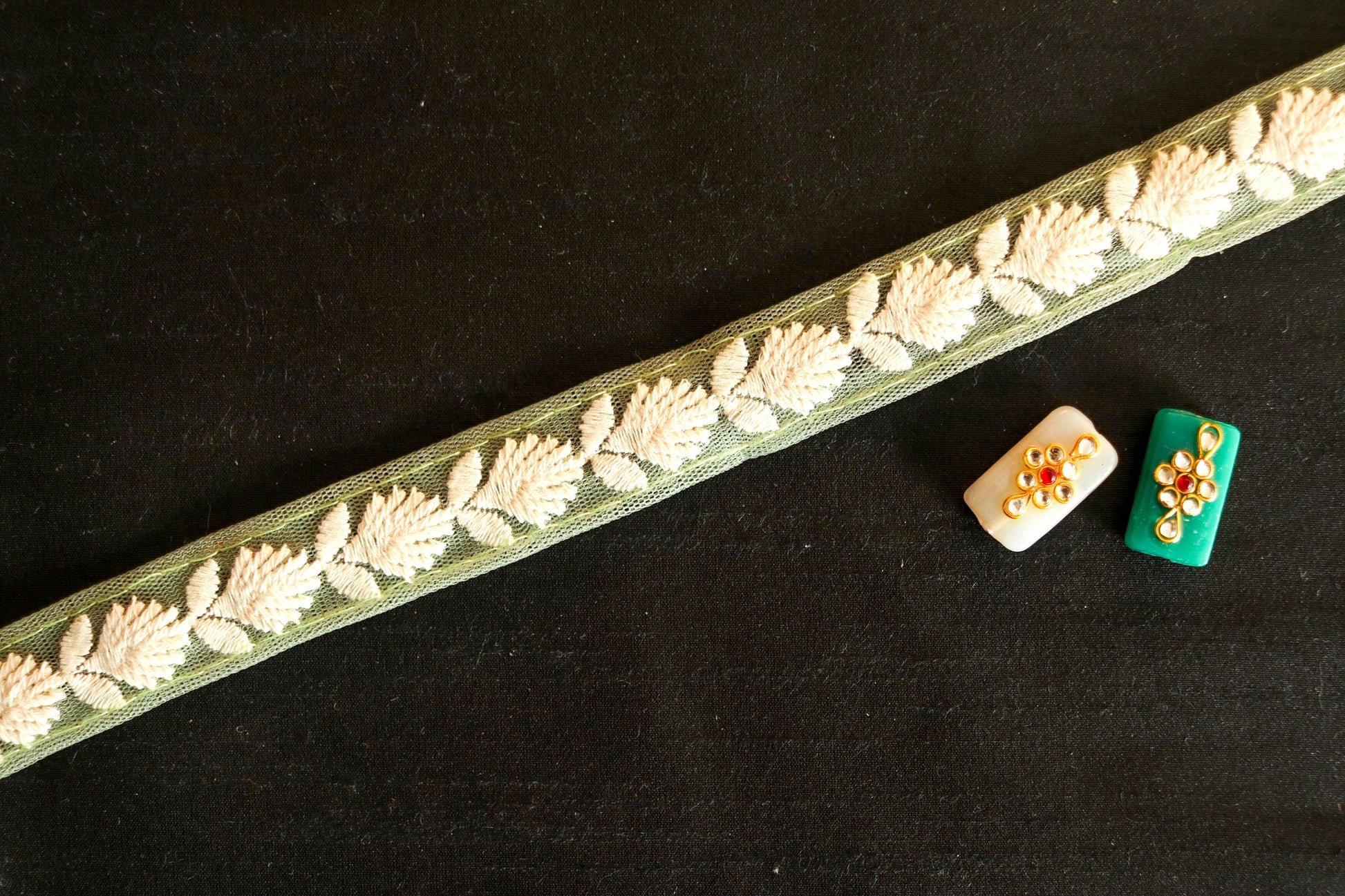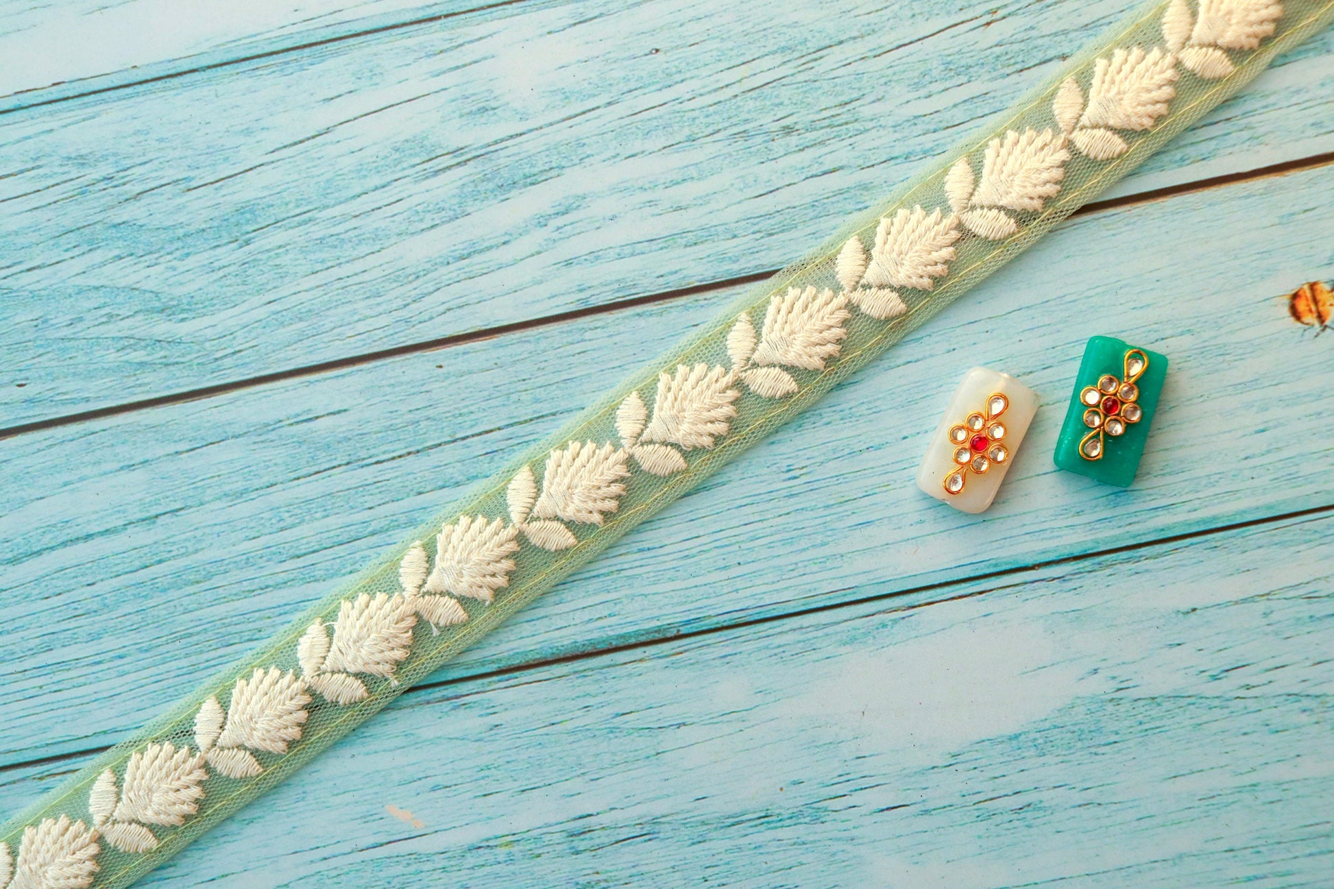 Green White Floral Embroidered Trim, Indian Fabric Net Embroidered Border, Lucknowi Chikankari Lace, Mint Saree Border, インド刺繍リボン, Price/mtr