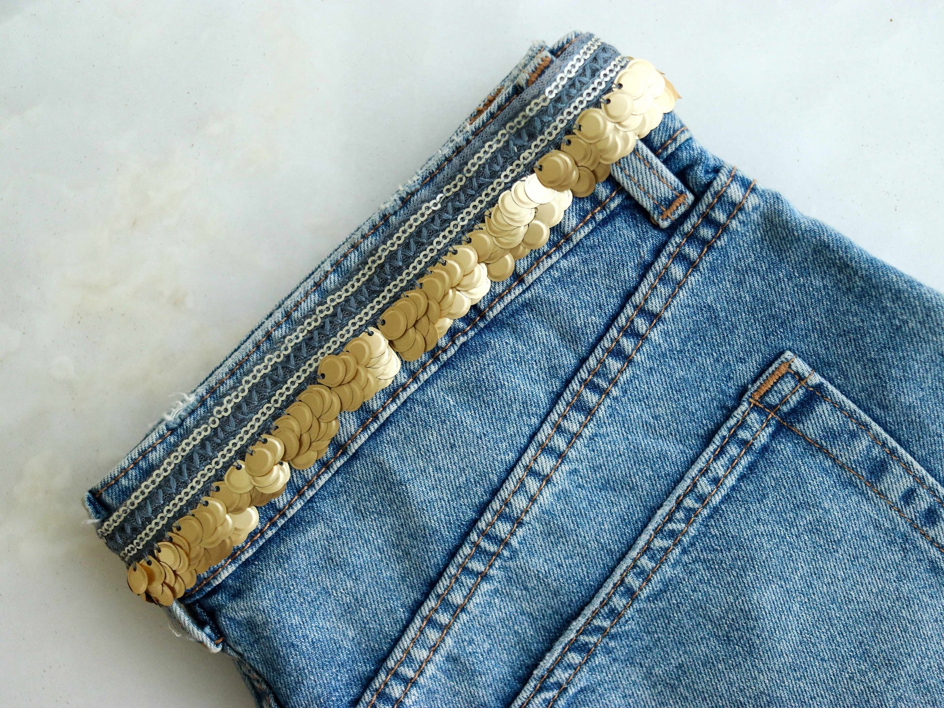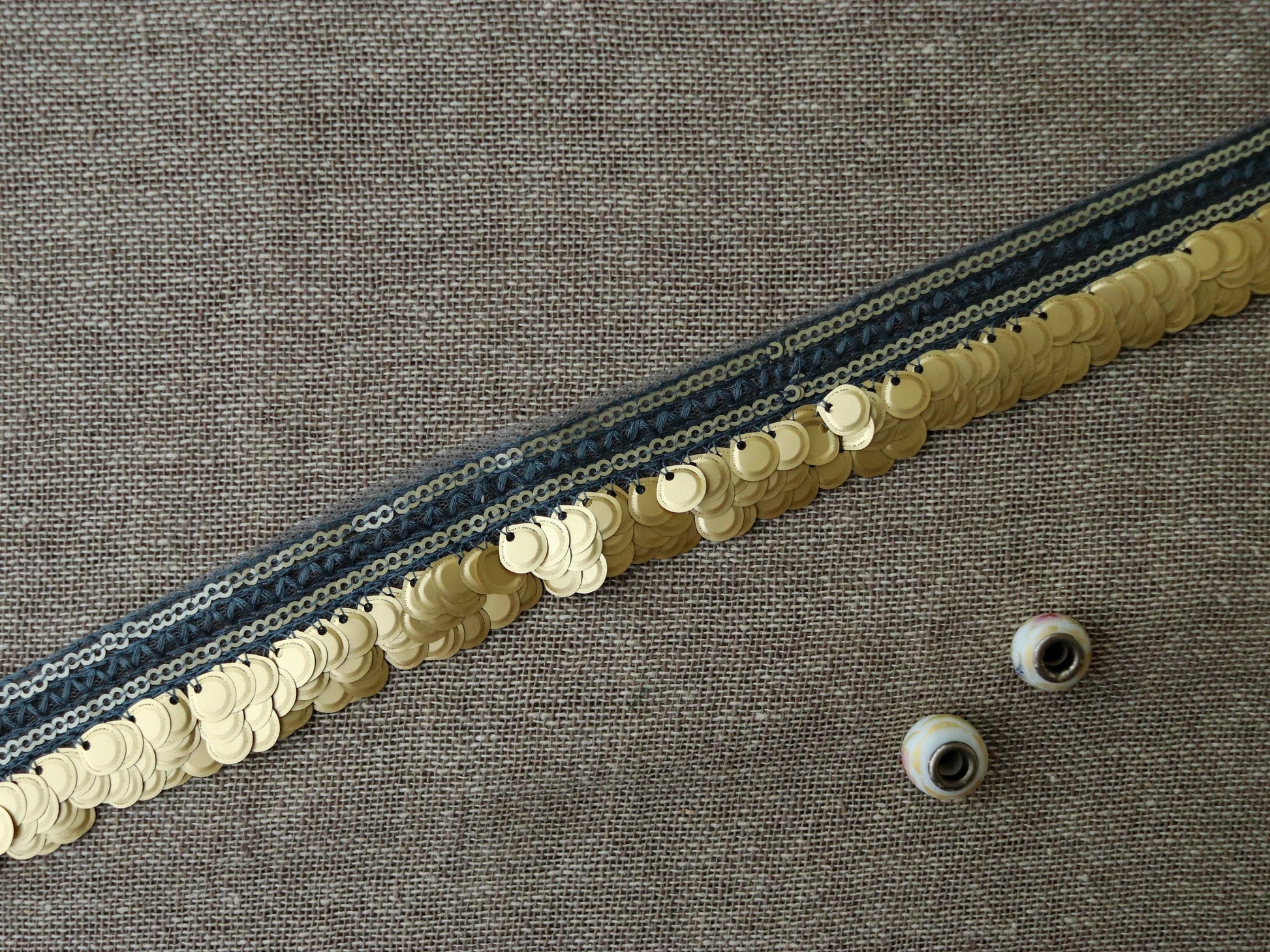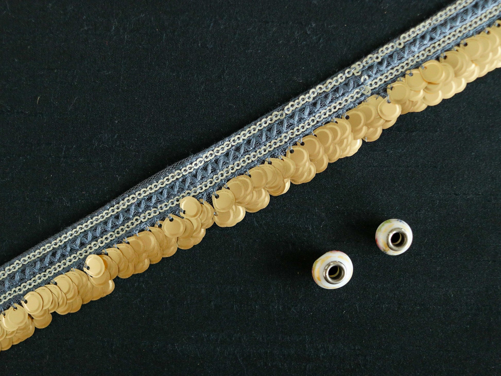 Created with flat large sequins in gold, on a grey net trim. Dangling together in complete harmony.