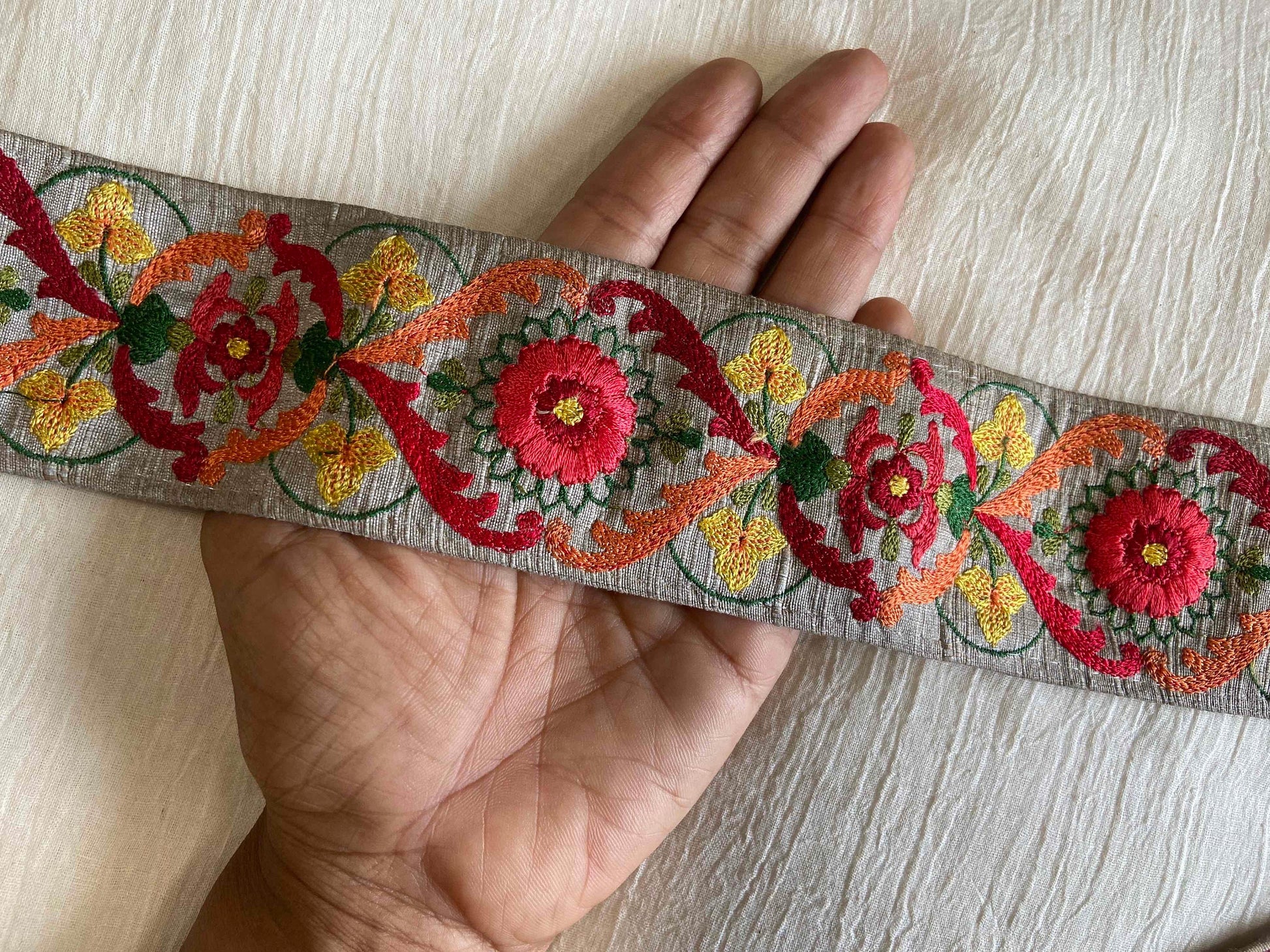 Grey Red Floral Embroidered Trim, Indian Fabric Embroidered Border, Parsi Embroidery Lace, Beige Grey Saree Border,