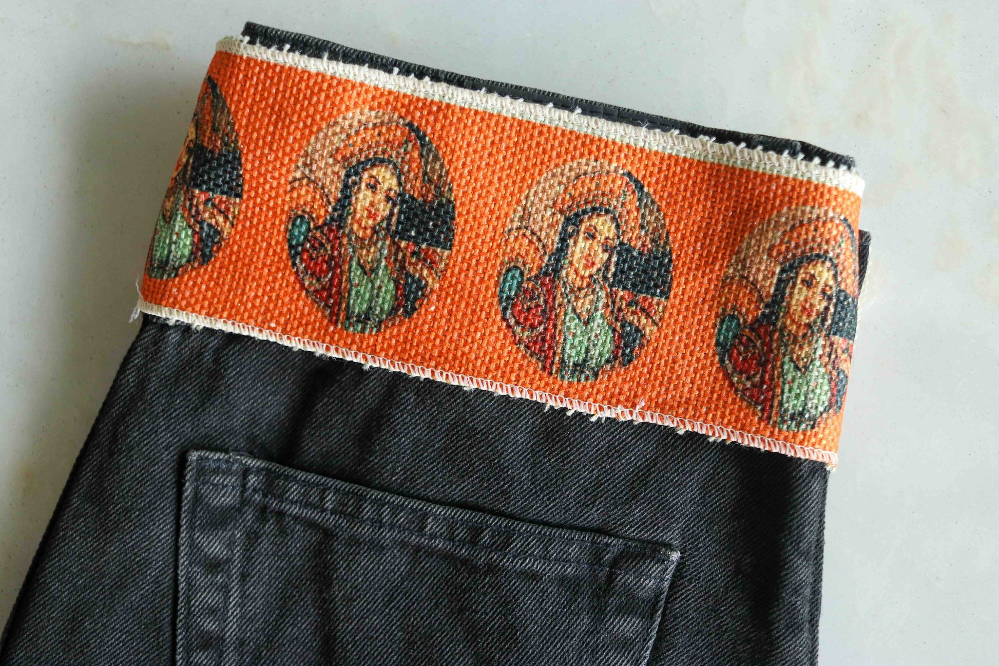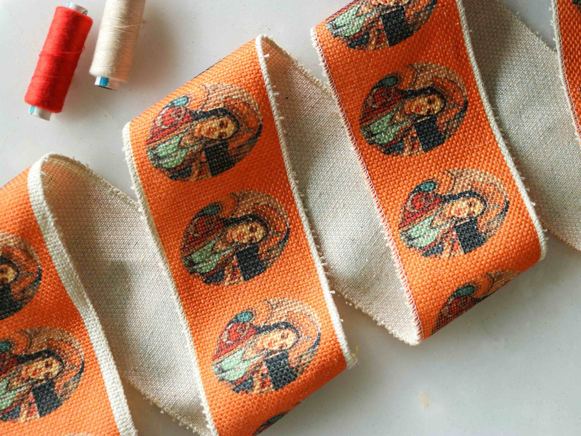A beautiful Indian queen decled in her royal finery! This gorgeous trim is created with digital print on jute, against an orange background. Created with a digital print on rustic jute fabric. A boho saree border that will convert your every project into a designer creation!