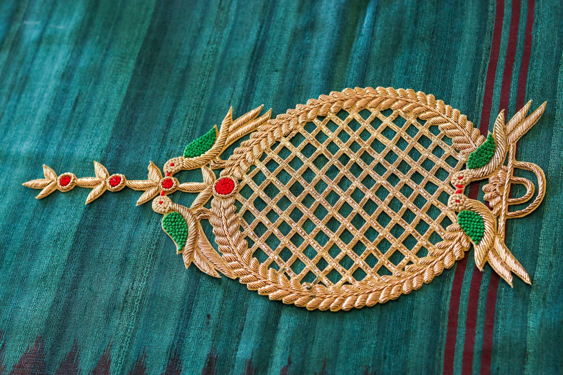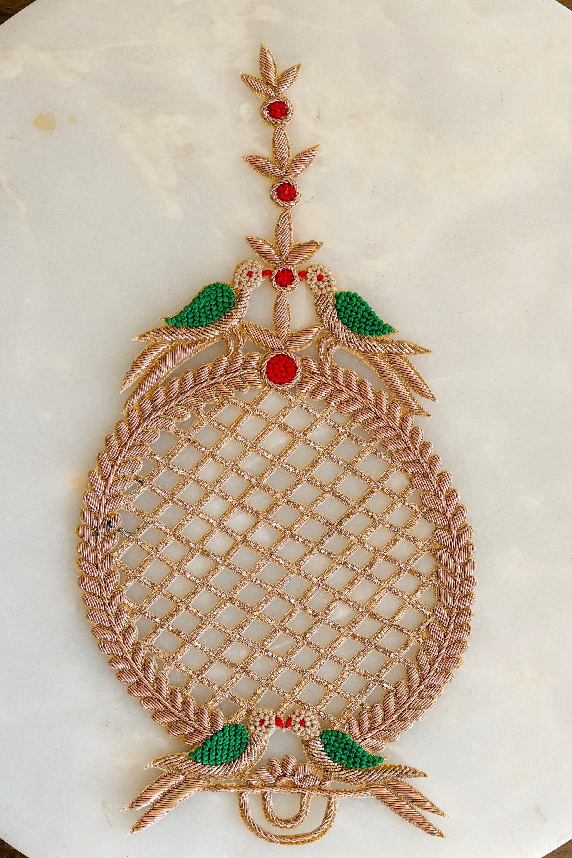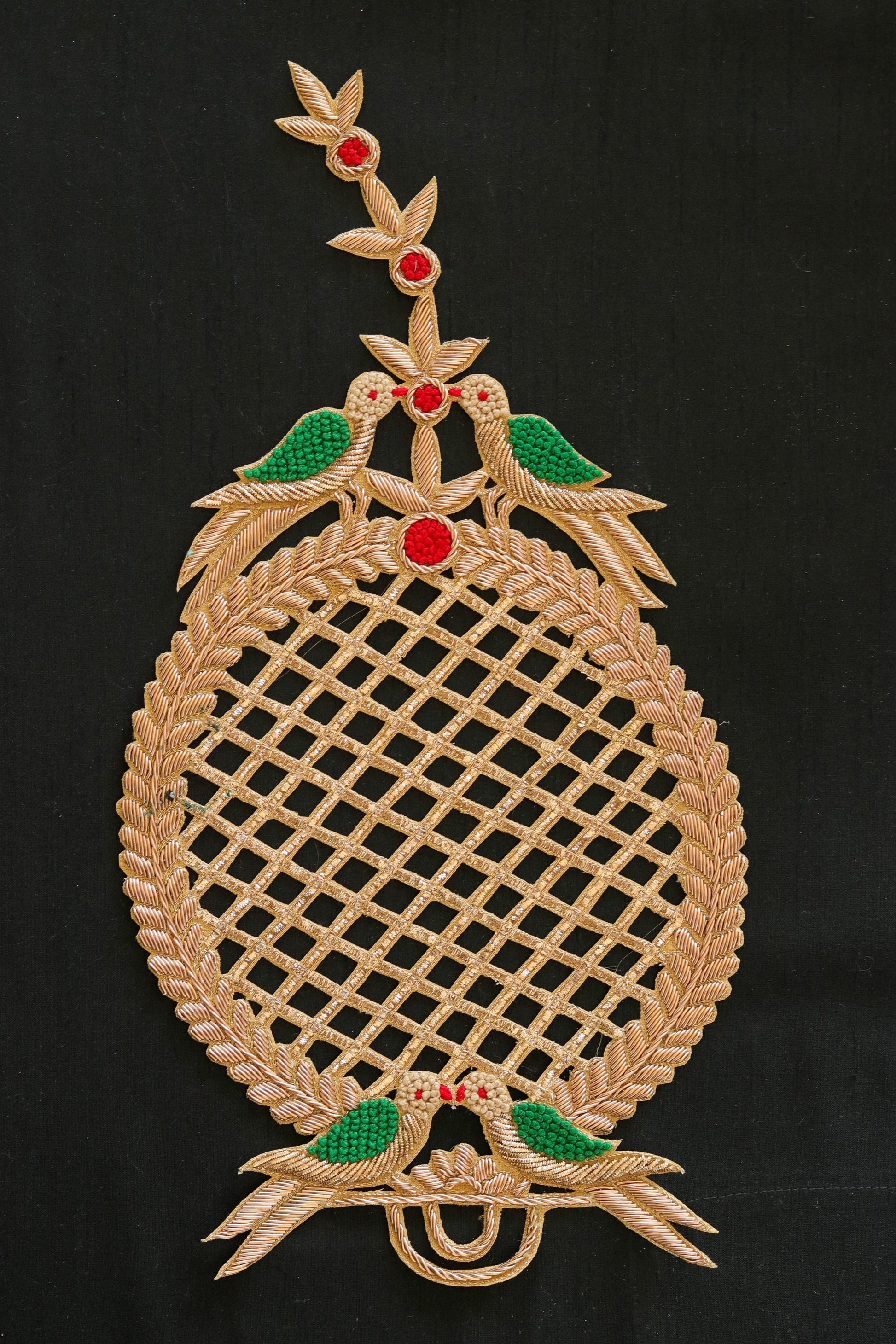 A gorgeous large patch created in the shape of a lattice window. Created with intricate embroidery in golden zari and zardozdi. With parrot pairs created in green embroidery. A patch that can dress up a jacket on its own and make it one in a million.