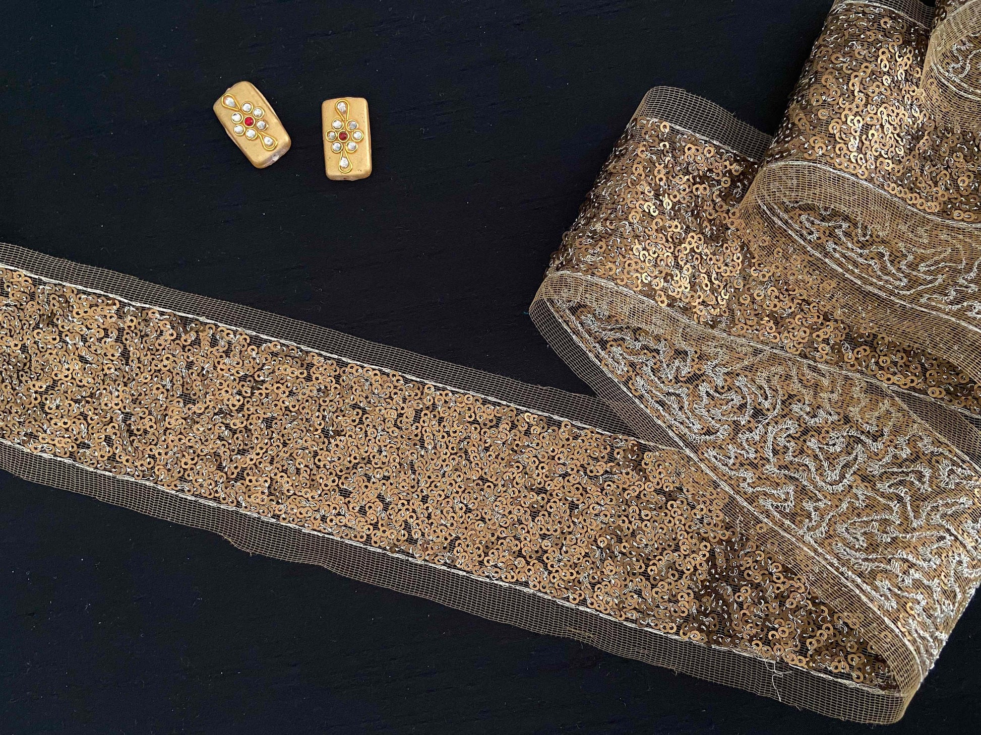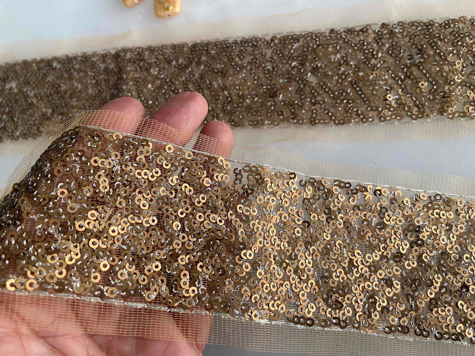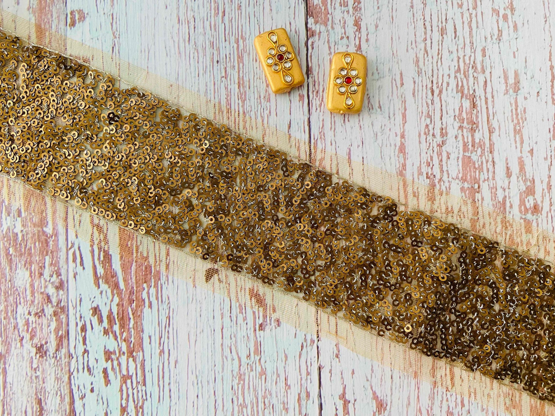 Light Gold Sequin Embroidered Trim, Gold Net Embroidered Border, Delicate Gold Lace, Indian Fabric Trim, Golden Saree Border,