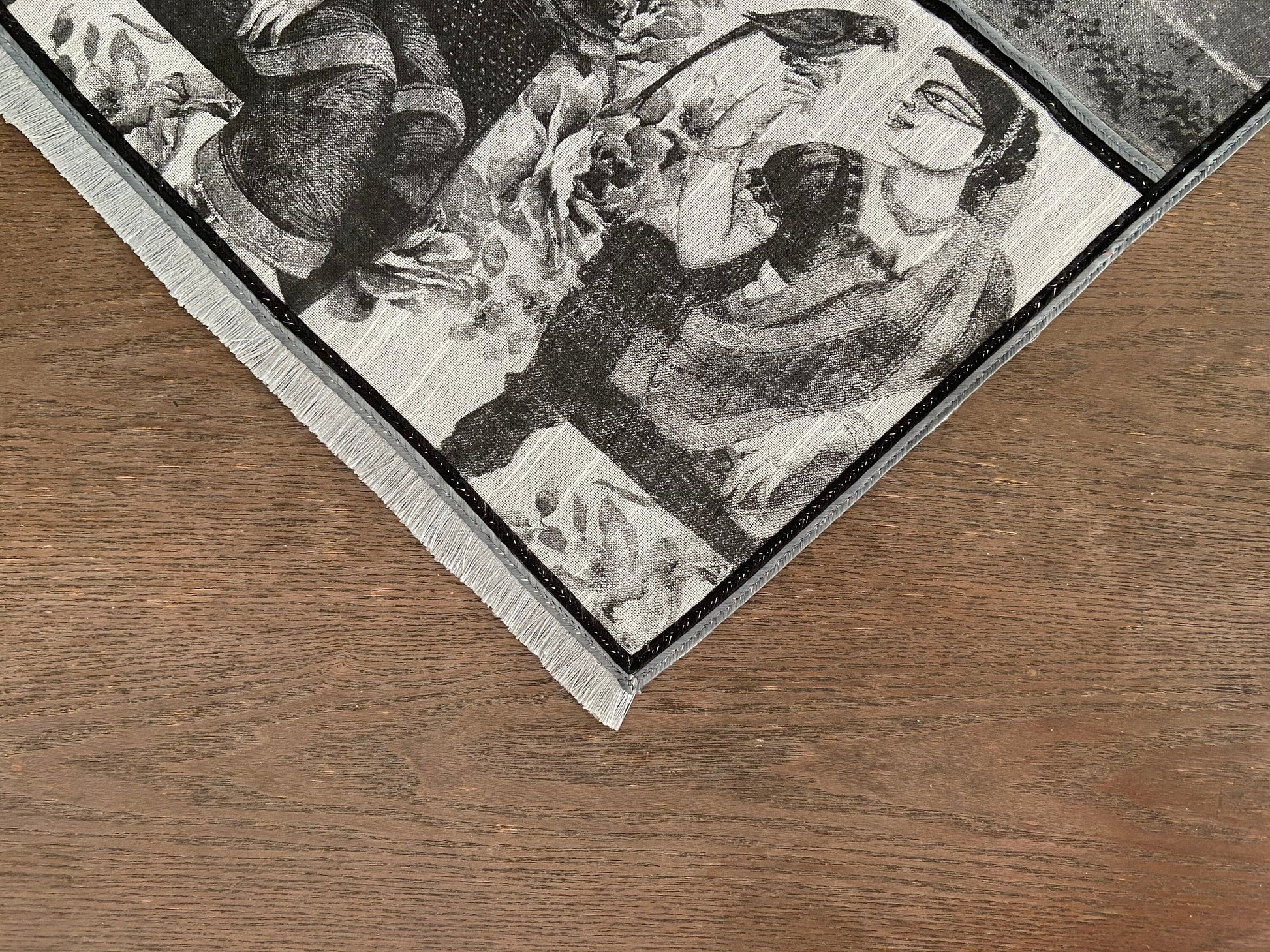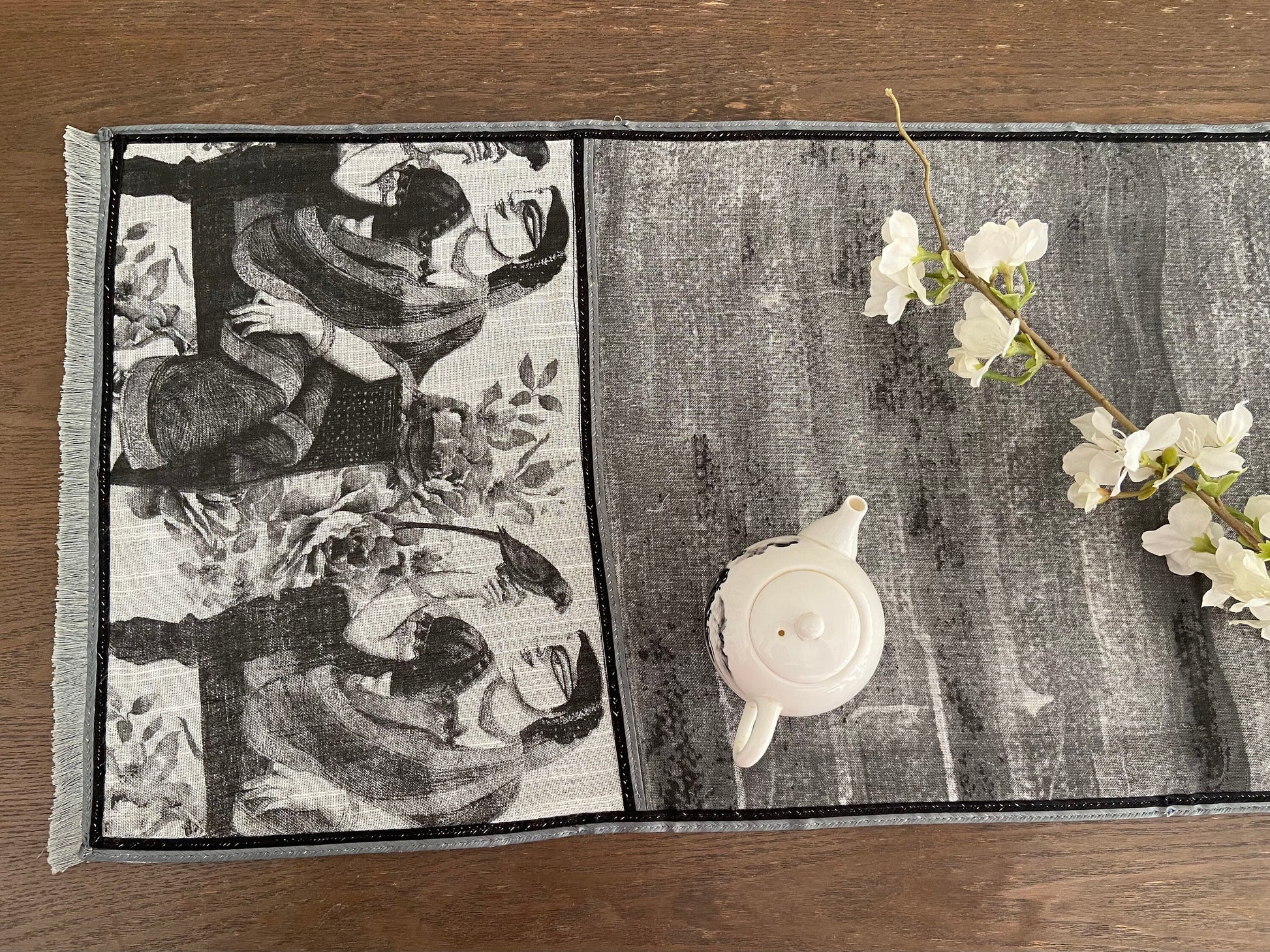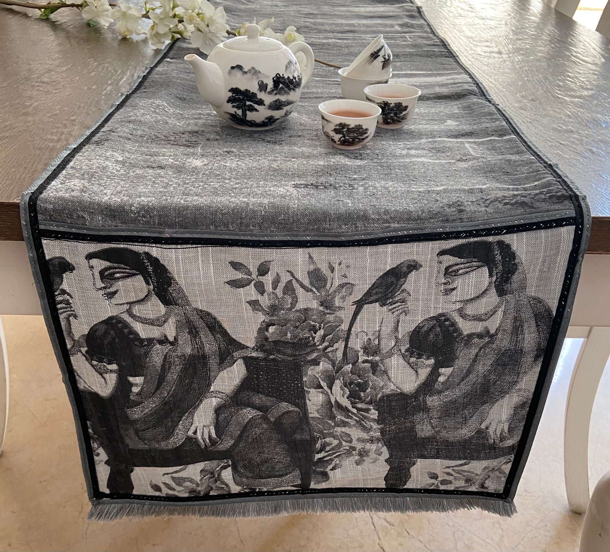 A beautiful runner depicting a princess with her parrot, printed on grey linen. Very lovingly handmade, with a lot of attention to details. Like the thin grey and black trims along the edges. Or the silver fringe that dresses up the two ends. The feel of linen and the grey white colour combination come together to create a very rustic look.