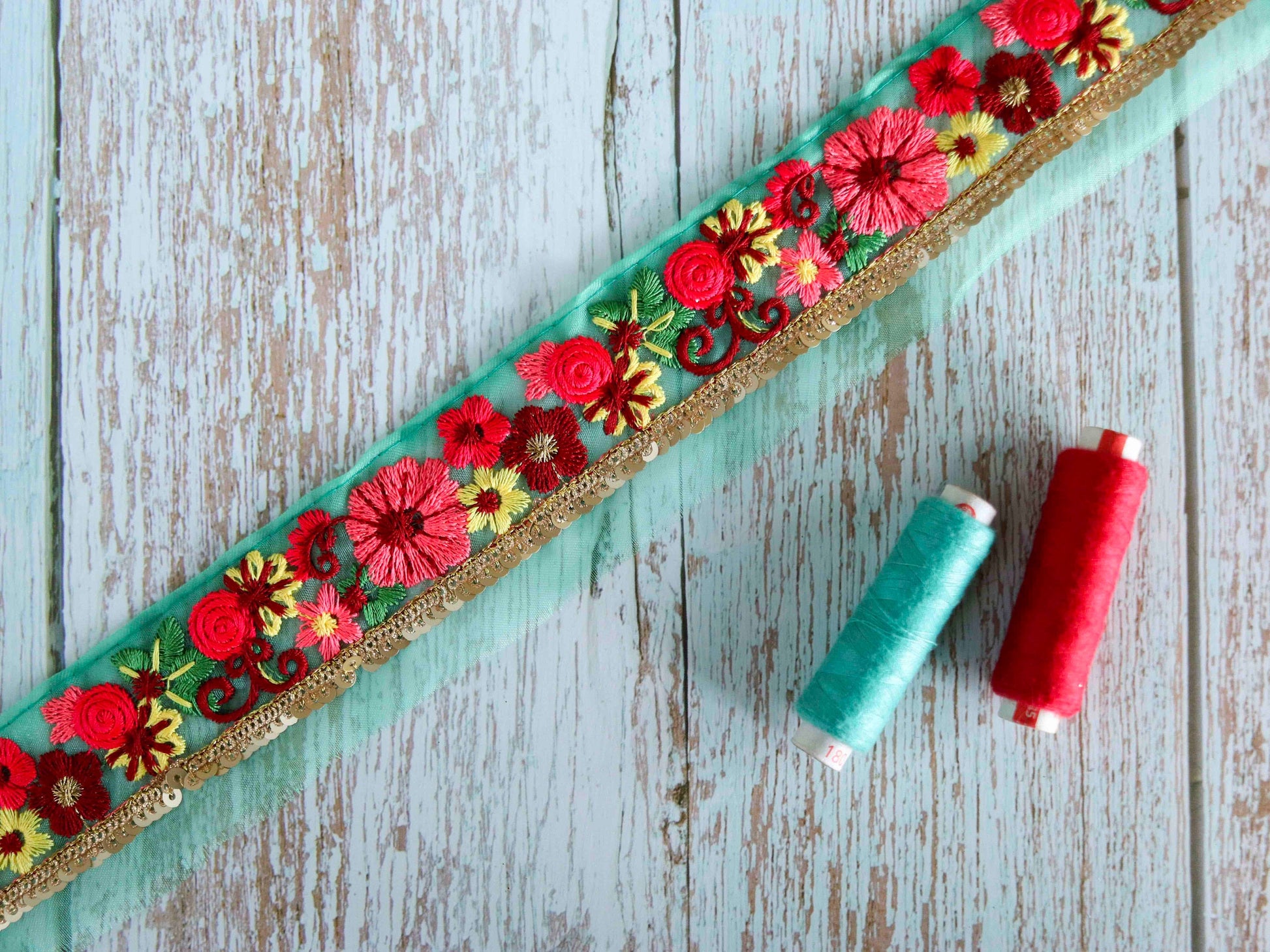 A pretty trim delicately embroidered with roses and daisies. In shades of pink, yellow and green, on a mint green net fabric. Embellished with tiny sequins in light gold to add a touch of glam. A bouquet of flowers to add vibrant joy to any project!