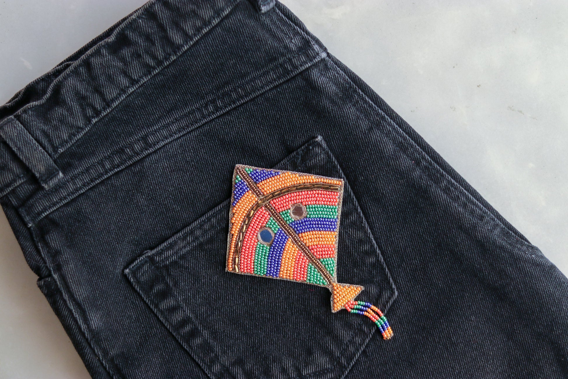 A quirky patch in the shape of a kite, created with pastel beads. To add a dash of quirky fun to your jacket or pocket, or bag!