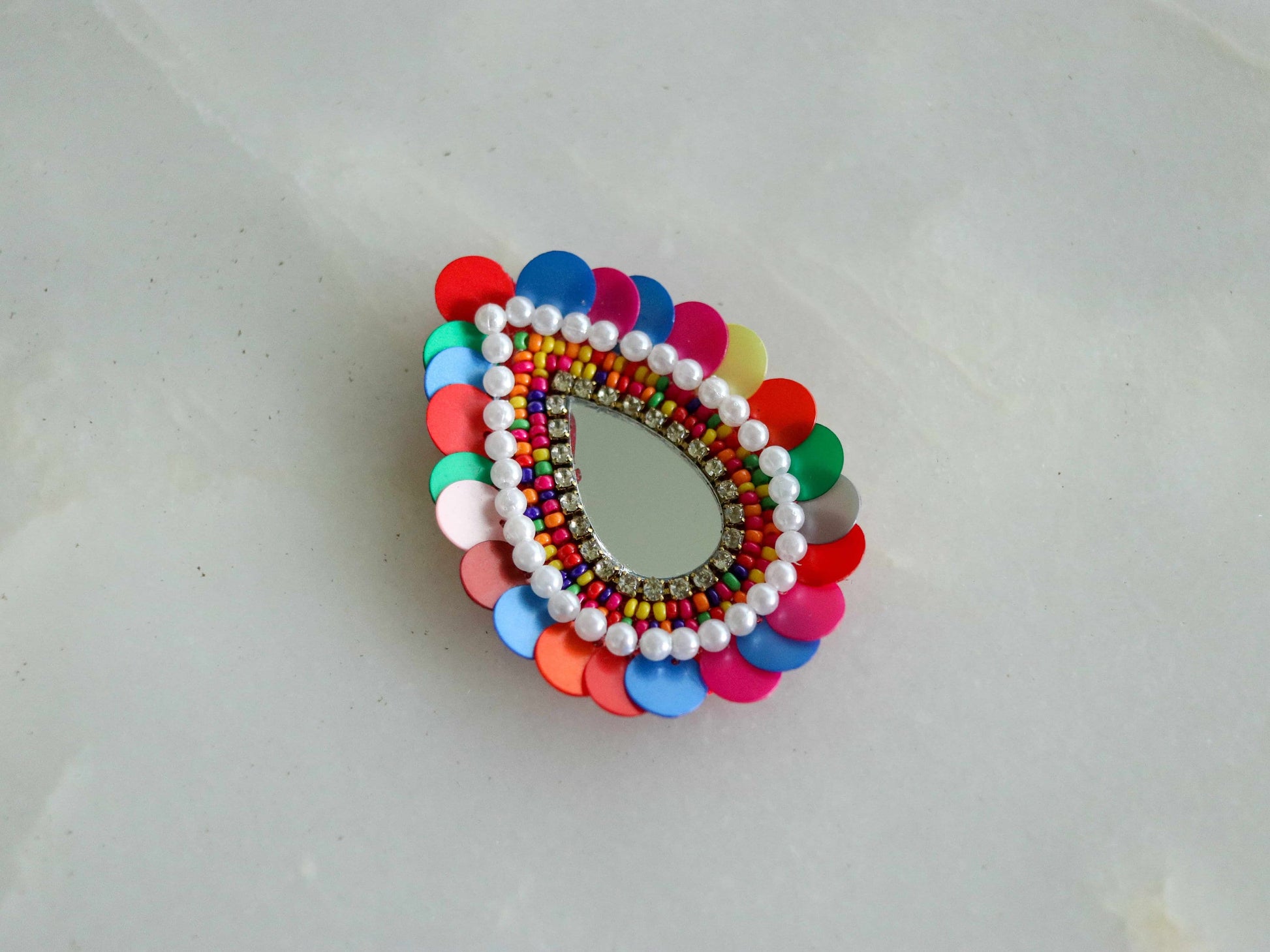This pretty handmade patch is made in the shape of a teardrop, or 'paan' (leaf) as it is called in India. Created with pastel colour sequins in soft shades. And rows of tiny white beads, colourful beads and diamantes. All surrounding the centre of attraction - an elegant piece of real mirror that makes it so much more vibrant. Adding just the right amount of sparkle to your day.