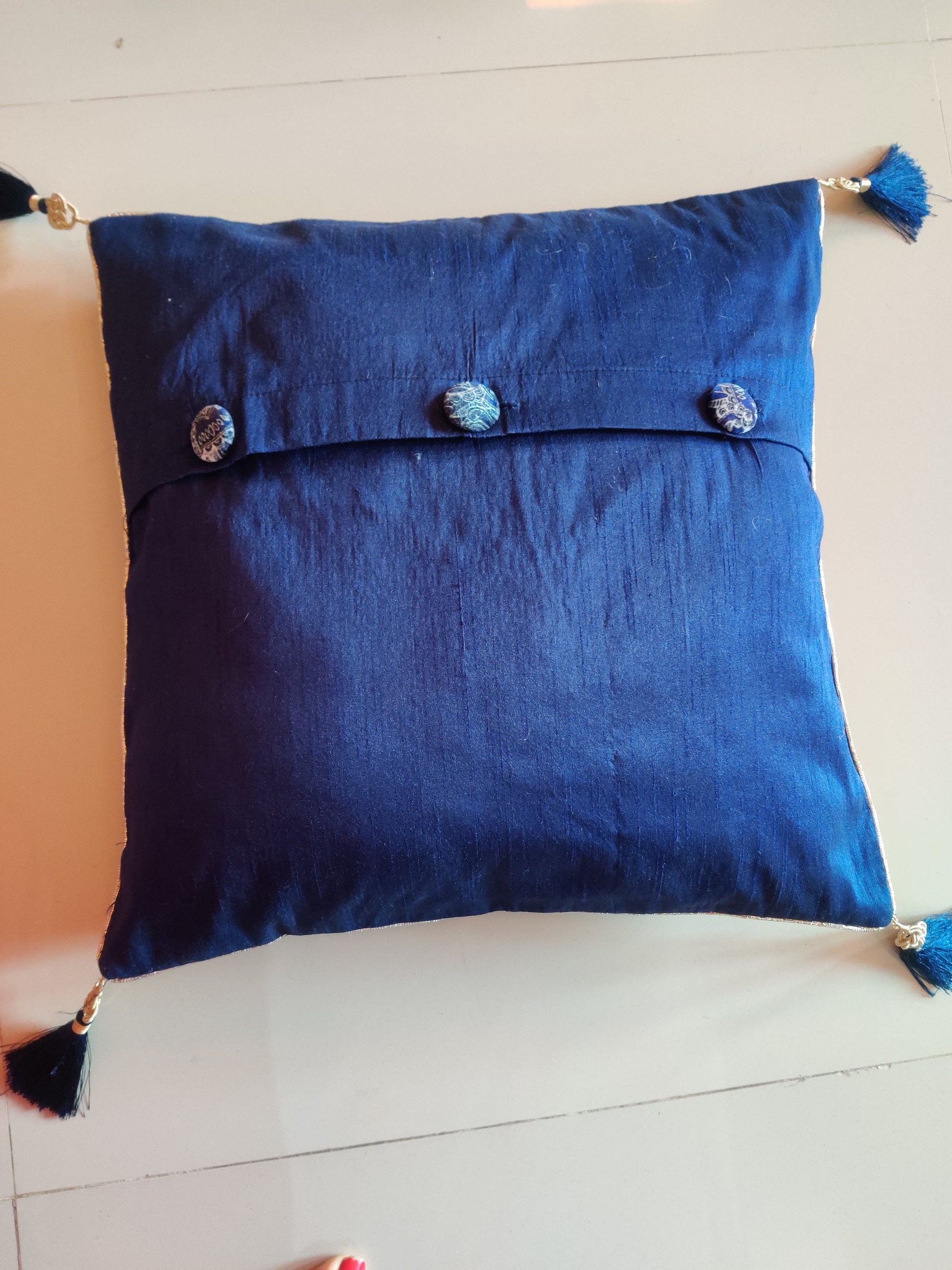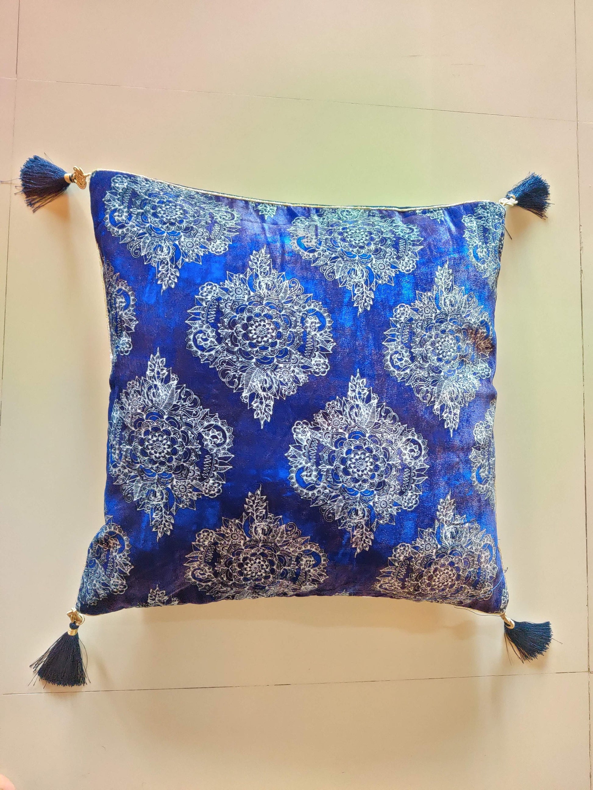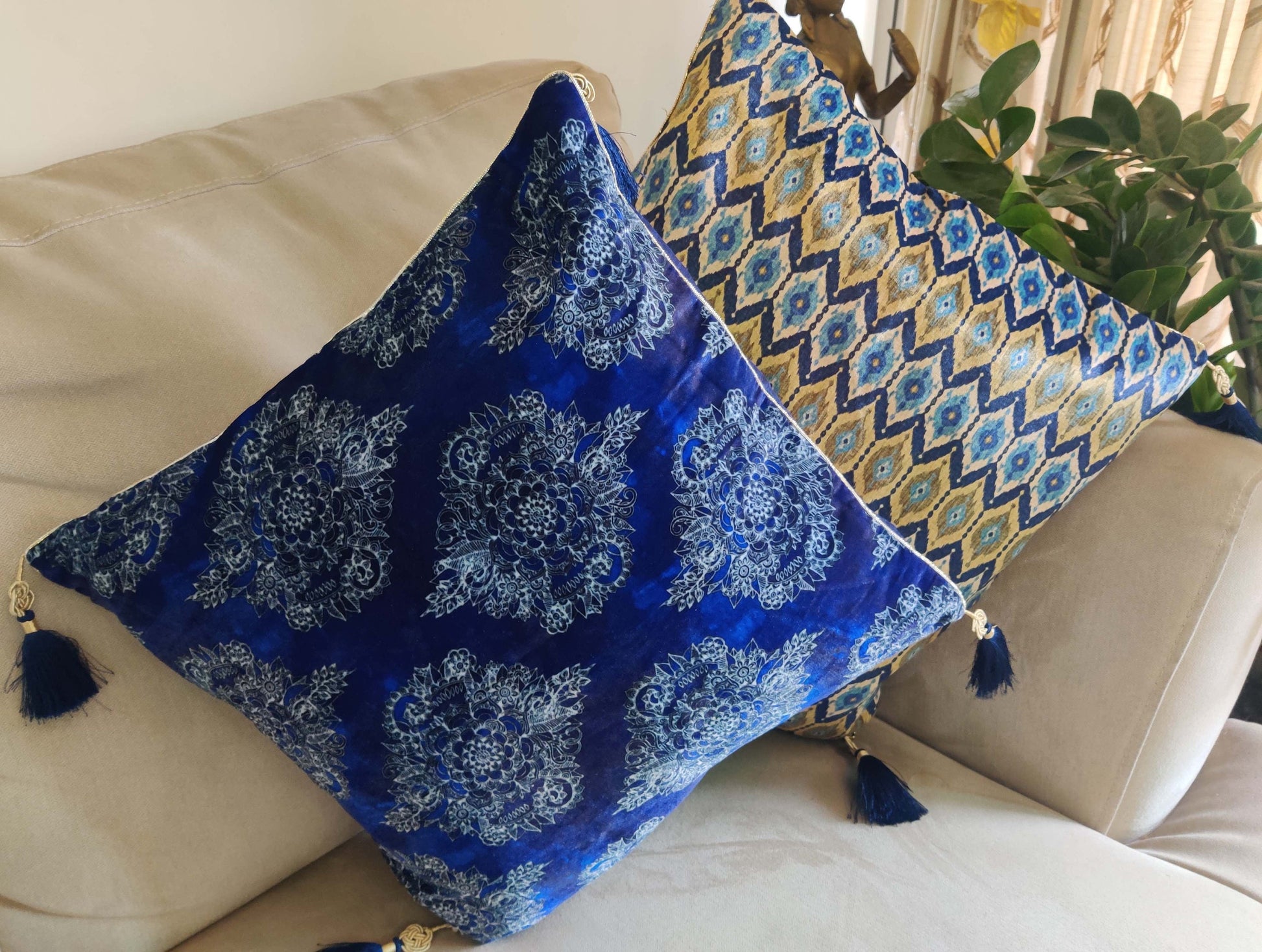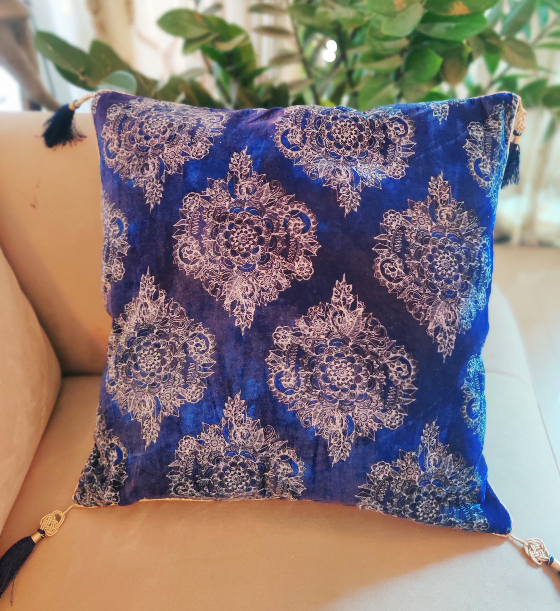 Soft and luxurious, vibrant yet elegant! Here's a plush velvet cushion cover with a vintage looking floral print. With very regal flowers in muted white on a royal blue silk velvet fabric. With a gorgeous blue and gold tassel on each of the four corners. And cute buttons of the same print on the blue art silk back - as we know it's the small things that bring big joys!