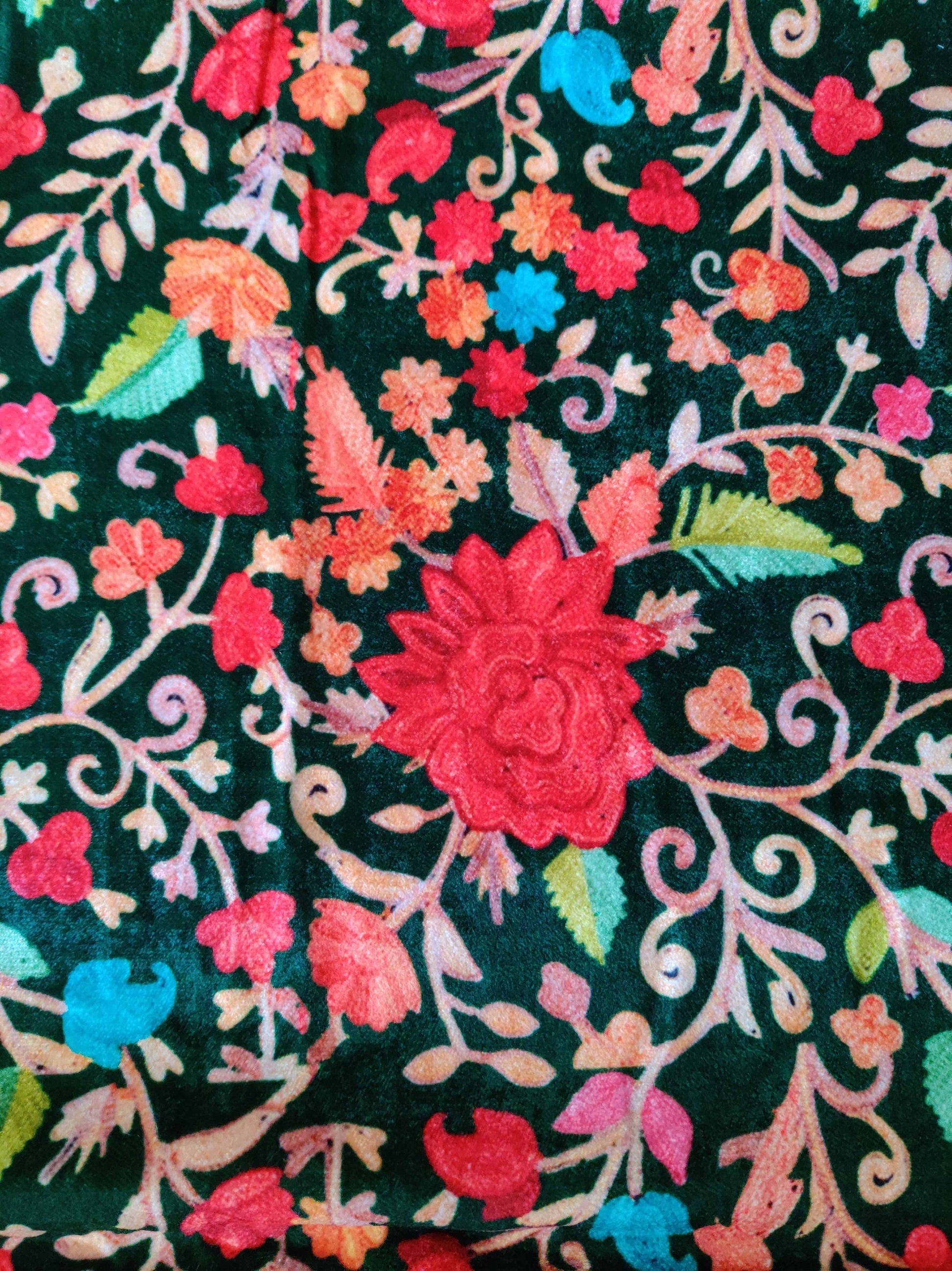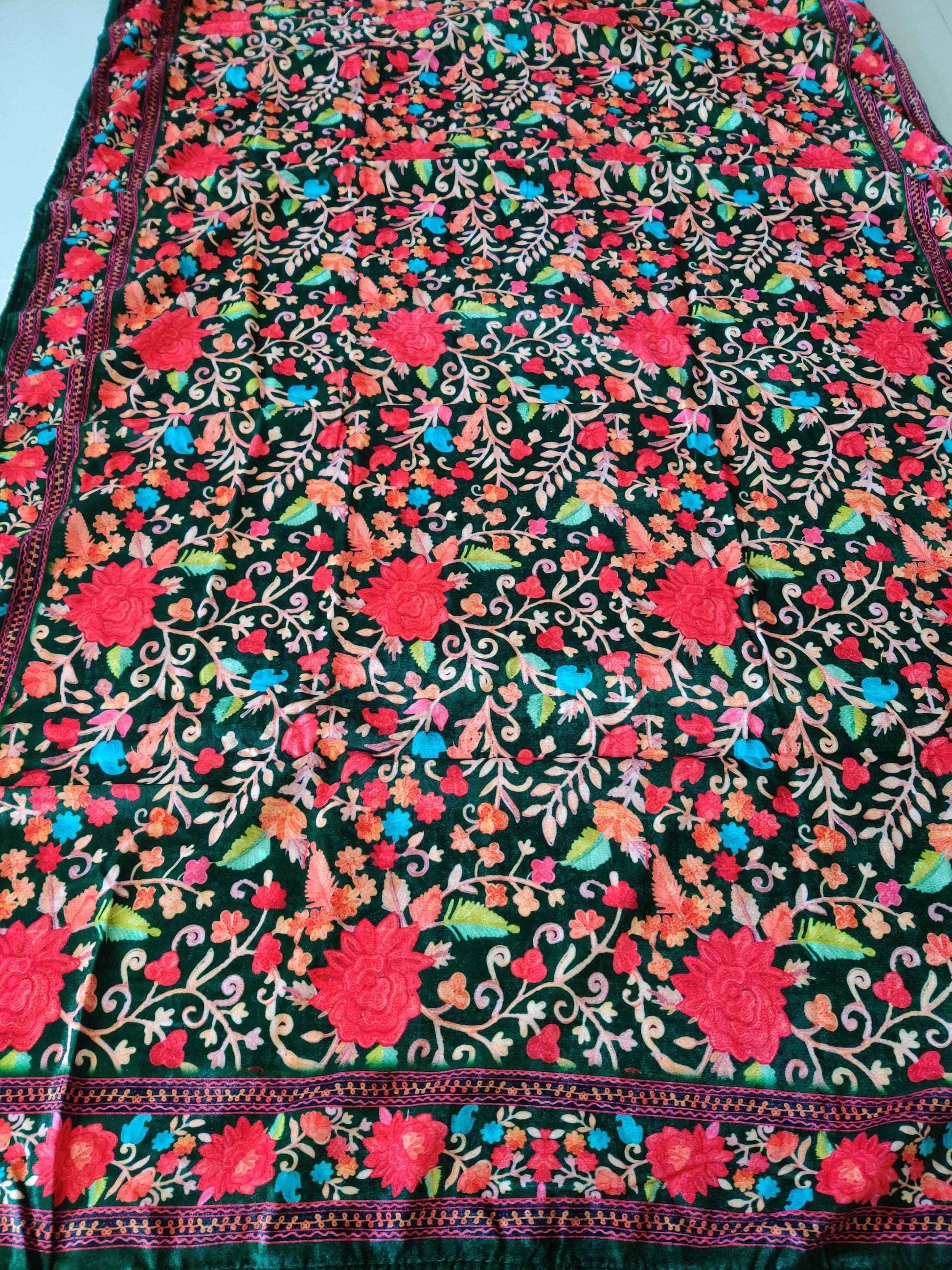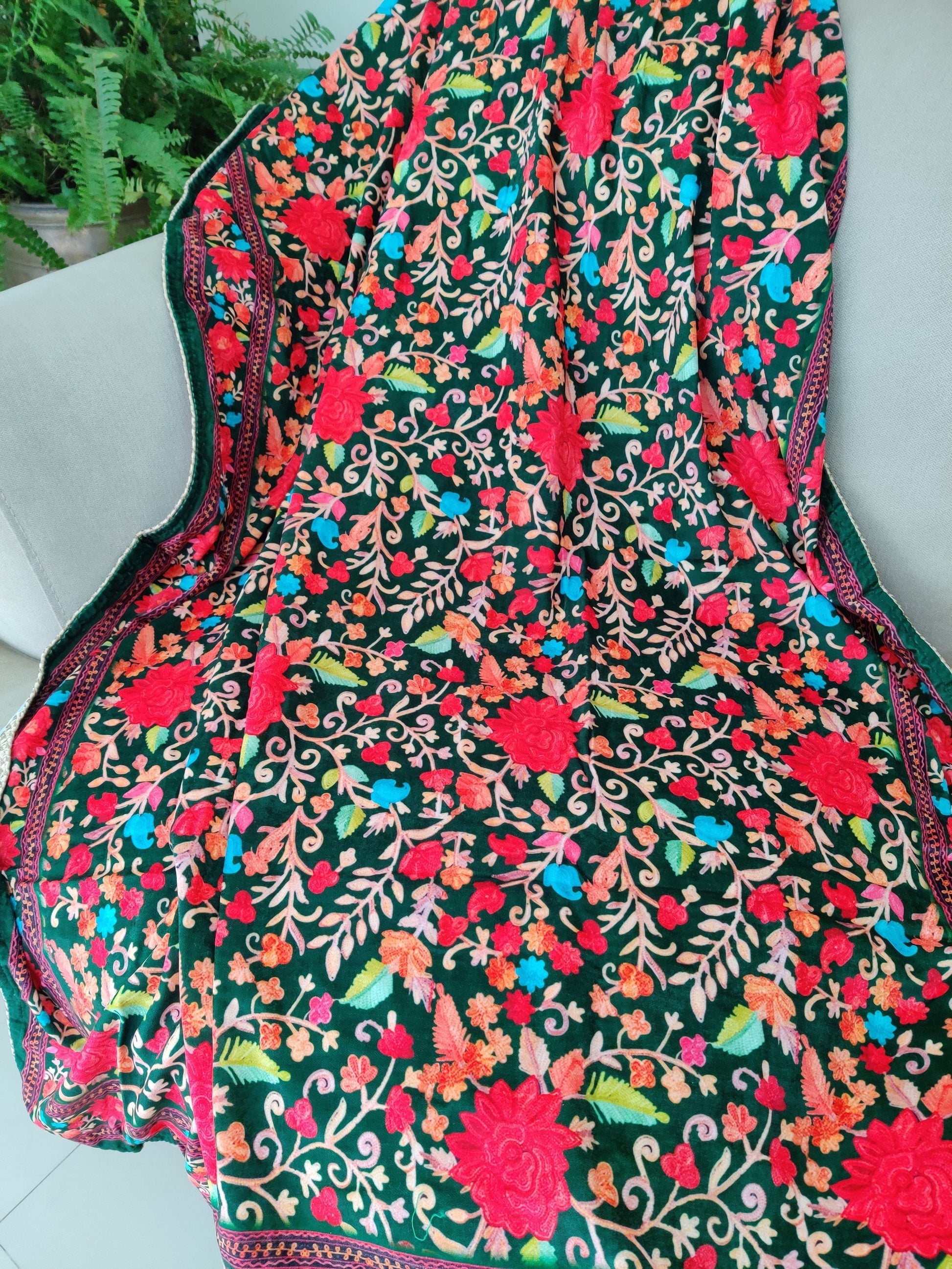 Soft and luxurious, vibrant and joyful! Here's a gorgeous velvet shawl in deep green. Covered with a shower of bold flowers. Created with a digital print that is so vivid it looks like dense embroidery, in deep pink, red and peach. The base colour is a unique deep green, also called bottle green by some. Bordered on all sides by a golden trim for a pop of glam. And edged on the inner borders with a thin gold trim to add a touch of glam.
