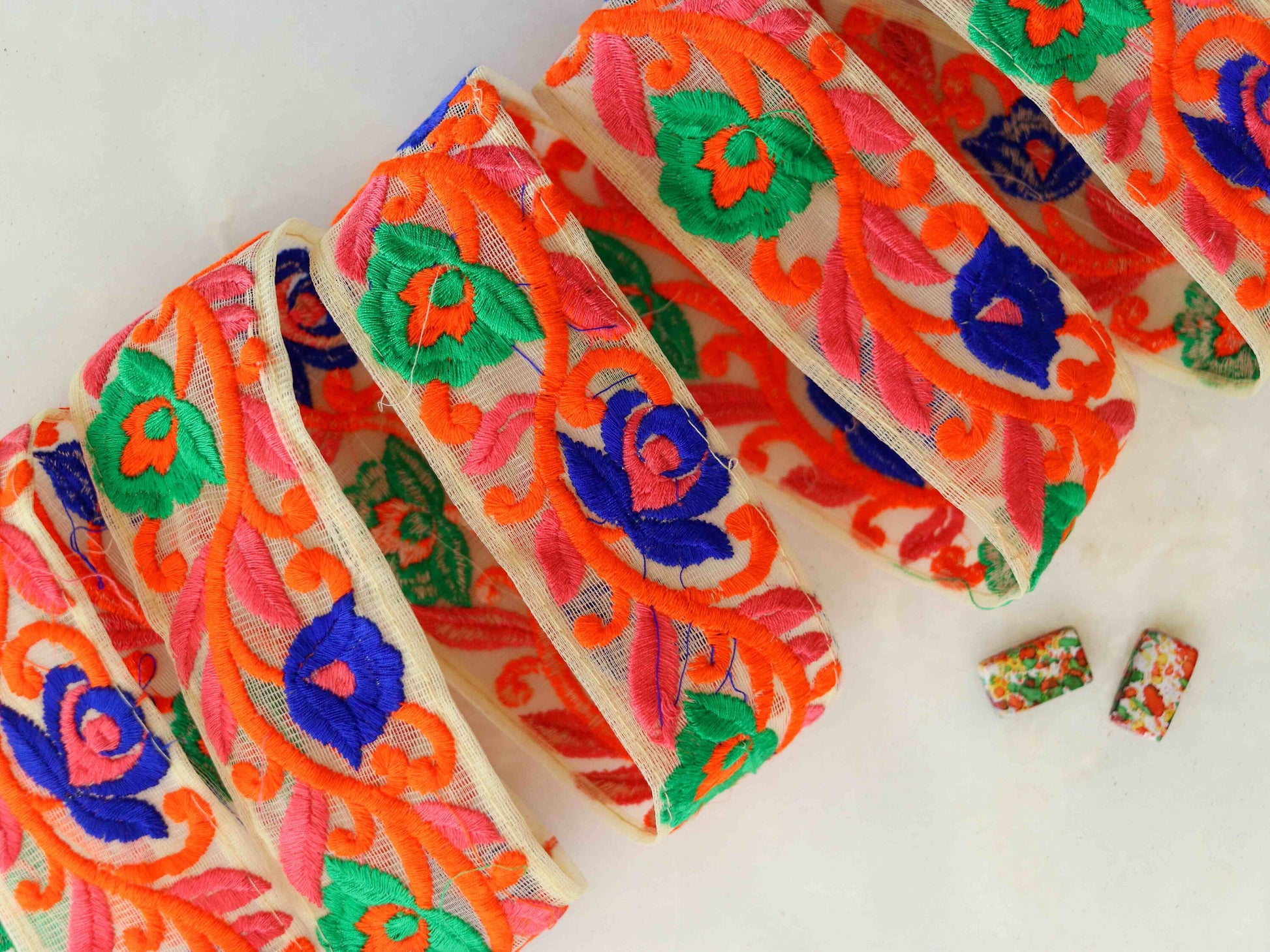 Orange Blue Floral Embroidered Trim,Orange Floral Border,Orange Blue Net Lace,Indian Fabric Trim,Floral Saree Border,Price/mtr