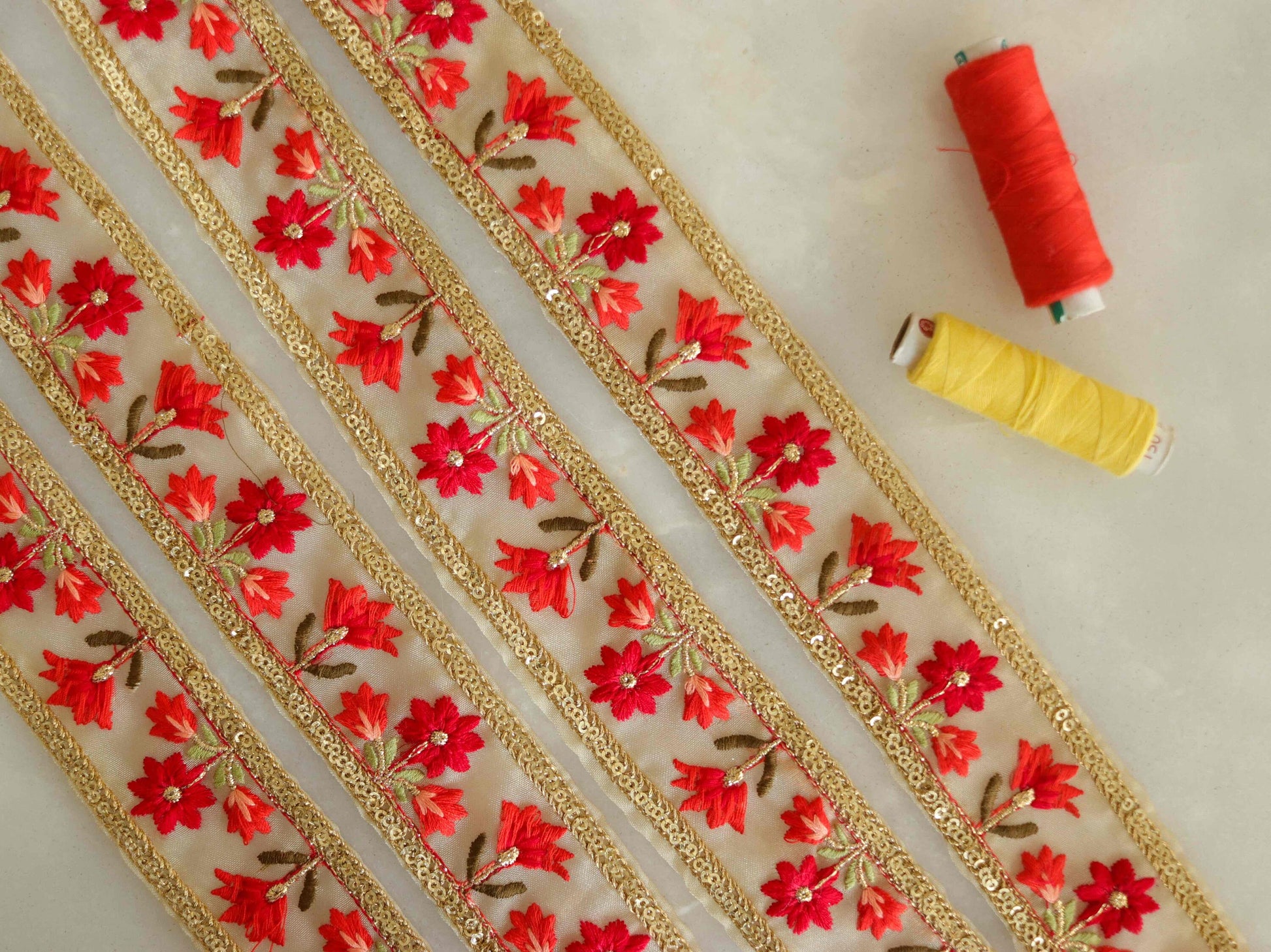 Orange Red Floral Embroidered Trim,Red Beige Floral Net Border,Floral Embroidery Lace,Indian Trim,Floral Saree Border,Price/mtr