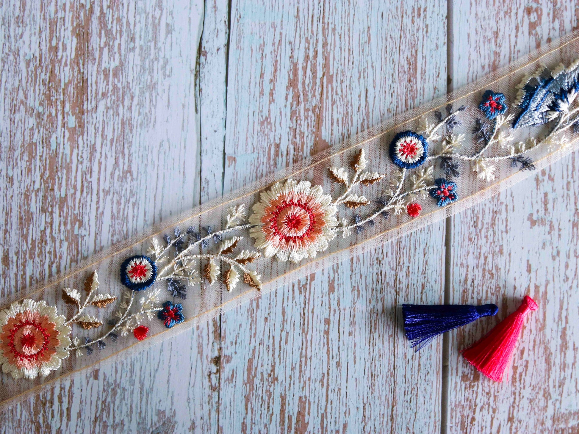A pretty trim embroidered with elegant flowers. In peach, pink, white and blue, on a very soft light beige net.