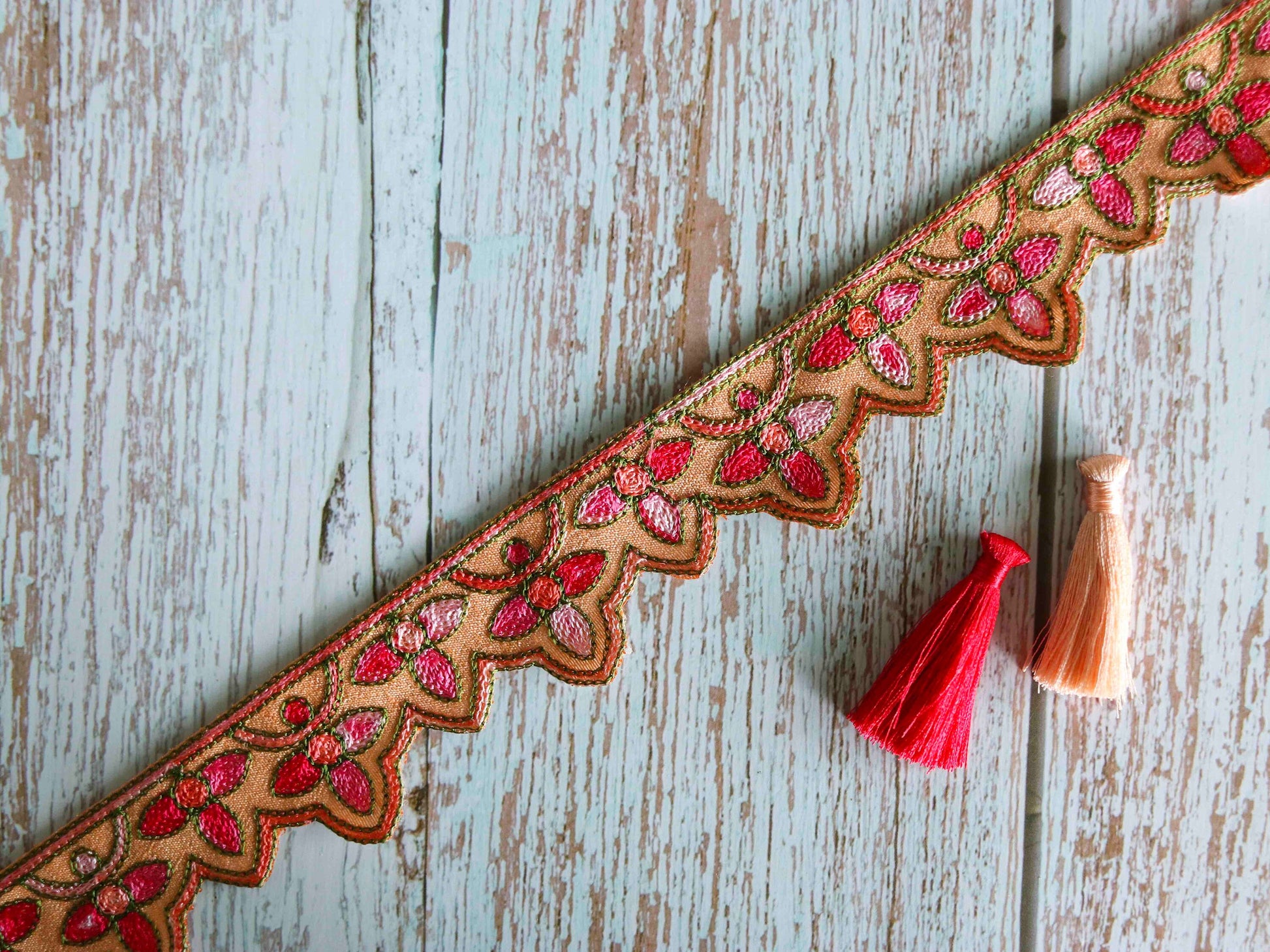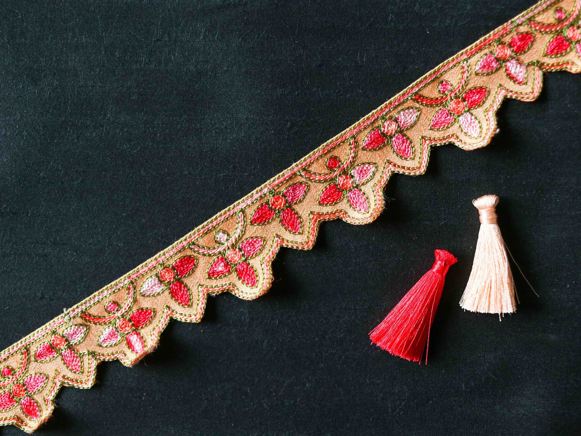 Pretty florals in shades of pink on a soft peach fabric base. A beautiful trim created with Kashmiri style crewel embroidery. That is so delicate it looks like a painting. Finished with cutwork to give it a very elegant look. Sure to make any project look like a heritage piece.