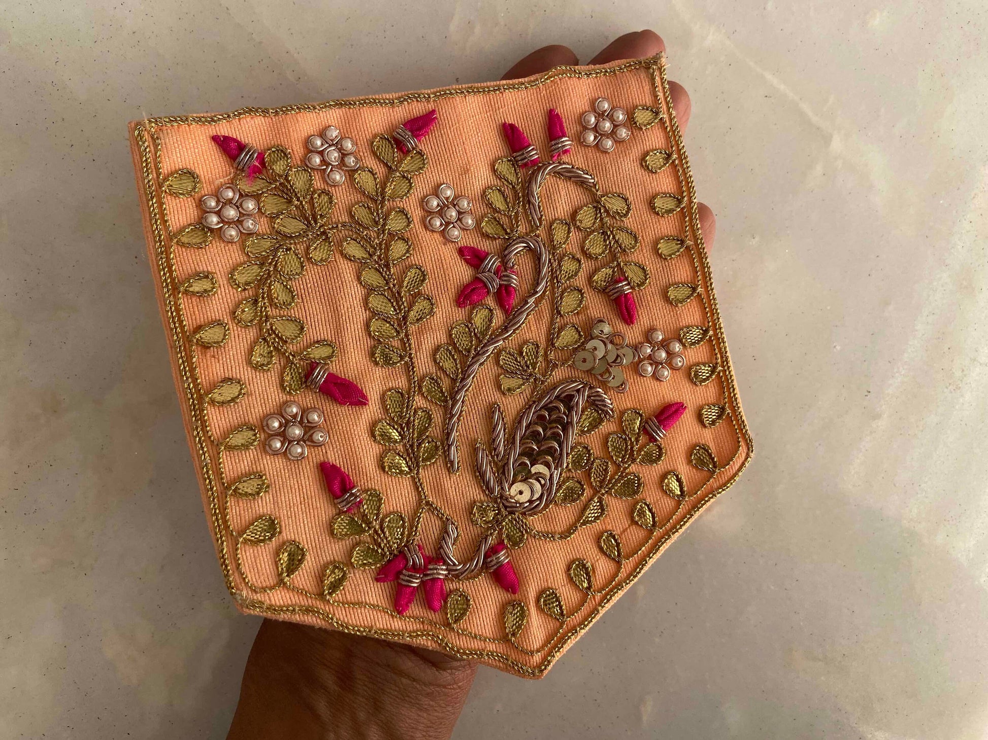 Quaint pocket shape patches in a pretty peach pink. Handmade with embroidery in 3 gorgeous designs. One with a bouquet of golden flowers, and a slender gold fringe. The other with three gorgeous flowers, in gold and blue. And the third with four little flowers placed neatly in four corners.