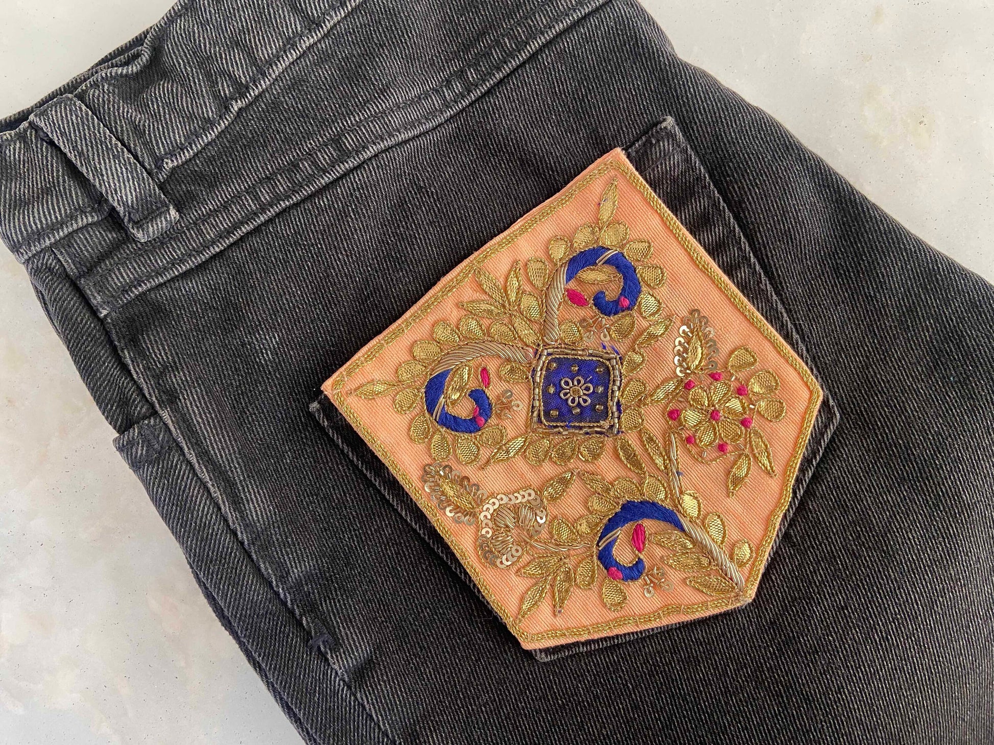 Peach Gold Embroidered Pocket Patch,Handmade Indian Peach Pocket Applique,Boho Kitschy Floral Bird Patch,DIY Denim Jacket Patch
