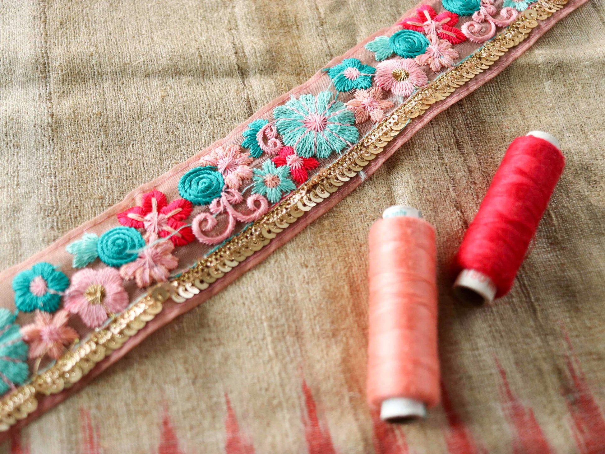 A pretty trim delicately embroidered with roses and daisies. In shades of pink and teal, on a pink peach net fabric. Embellished with a row of tiny sequins in light gold to add a touch of glam. A bouquet of flowers to add vibrant joy to any project!