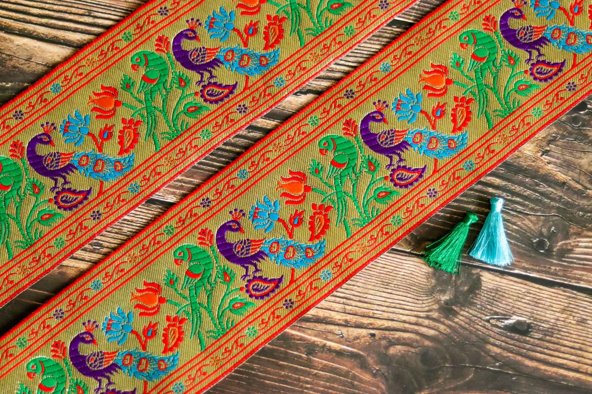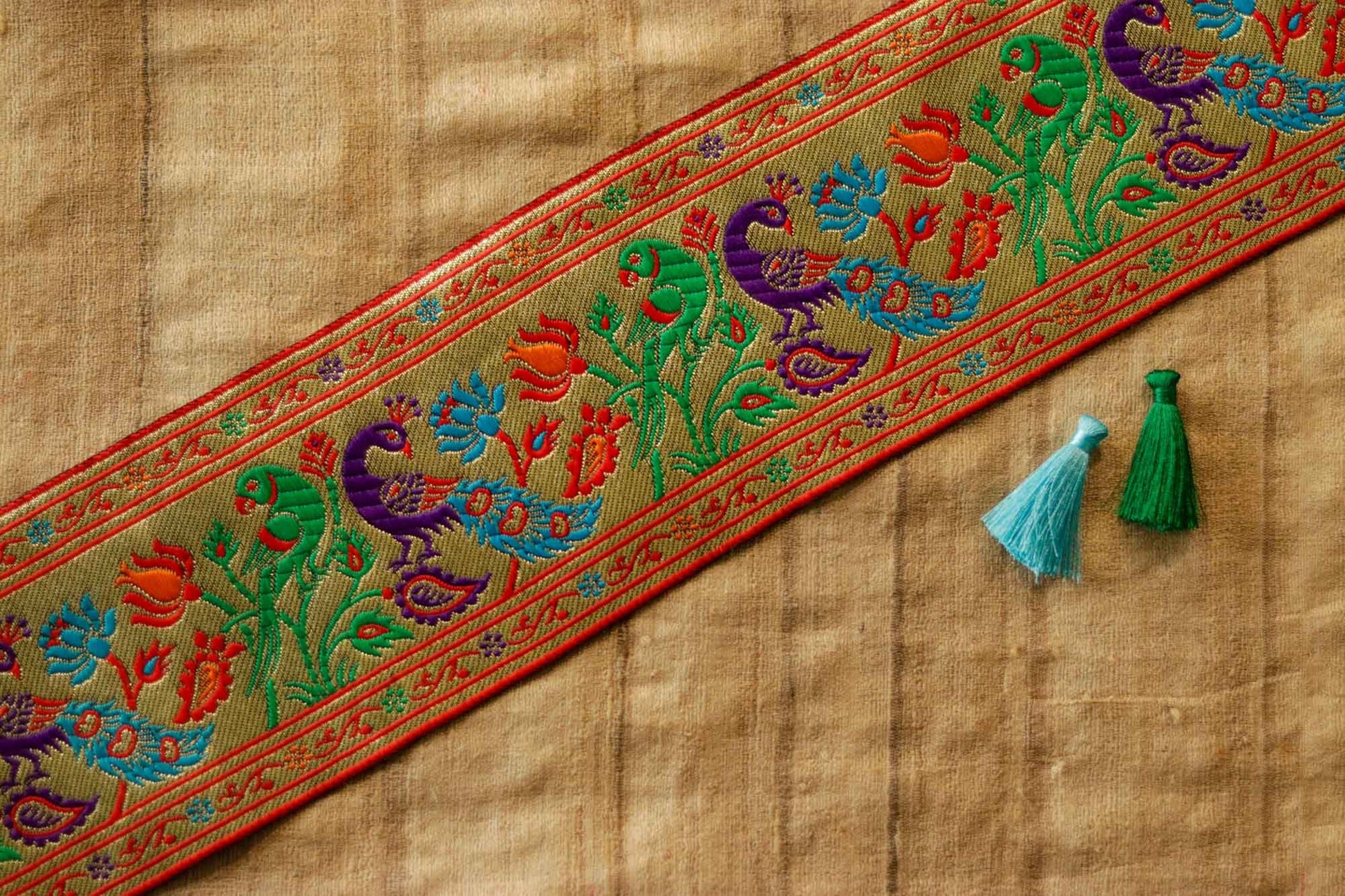 A gorgeous trim created with Banarasi brocade weave. With graceful peacocks and parrots woven in green and purple, along with colourful flowers. Embellished with a golden weave, on a soft silk fabric.