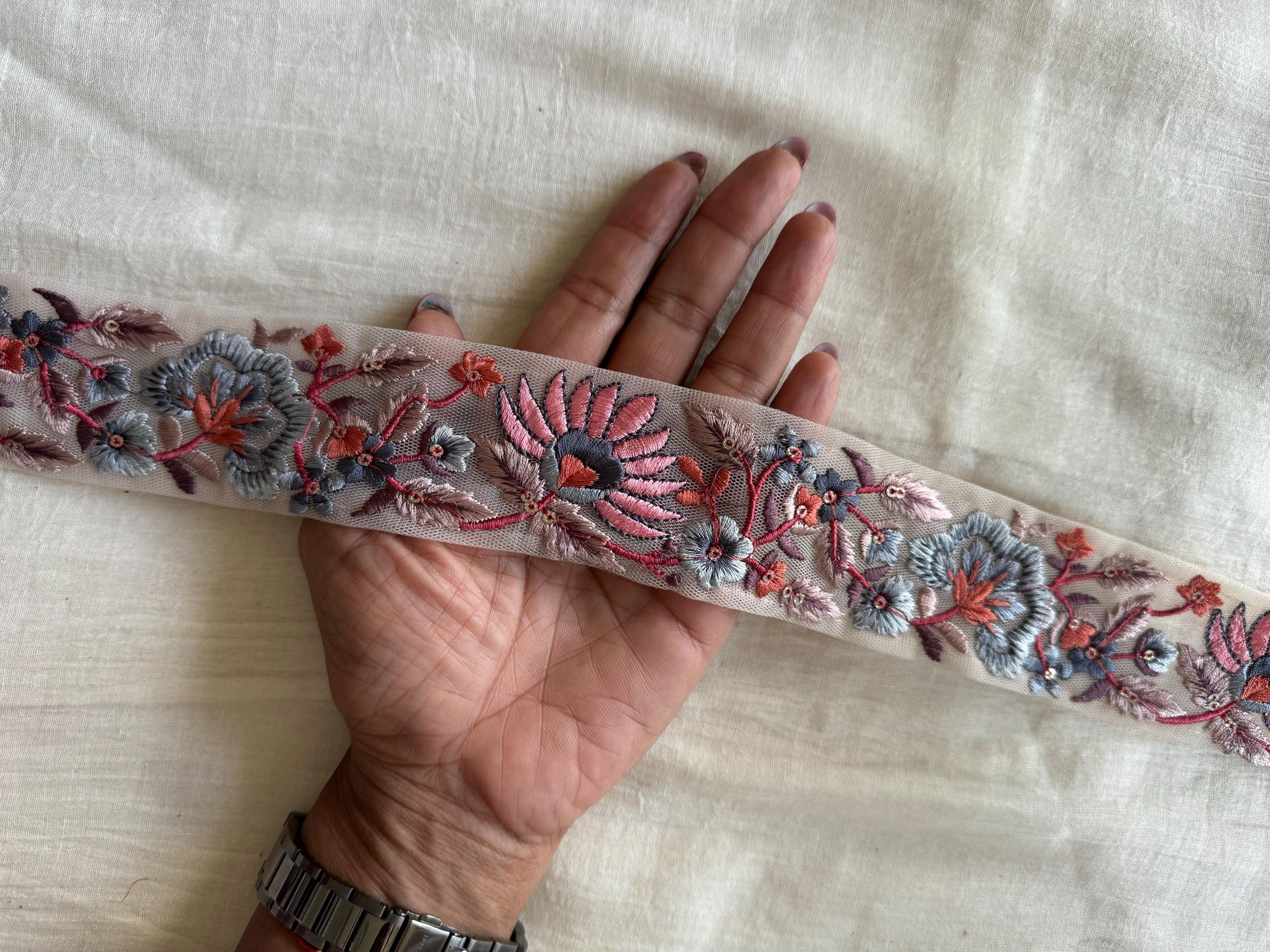 Pink Blue Floral Embroidered Trim, Net Floral Border, Pink Peach Floral Net Lace, Indian Fabric Trim, Saree Border, インド刺繍リボン