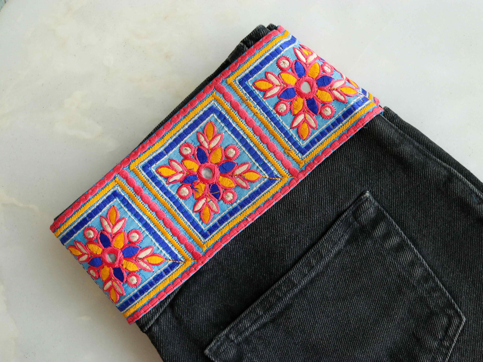With a typical phulkari geometric floral pattern made with dense stitches. With pink, blue and orange threads on a blue base. Sure to bring a boho charm to anything you use it on.