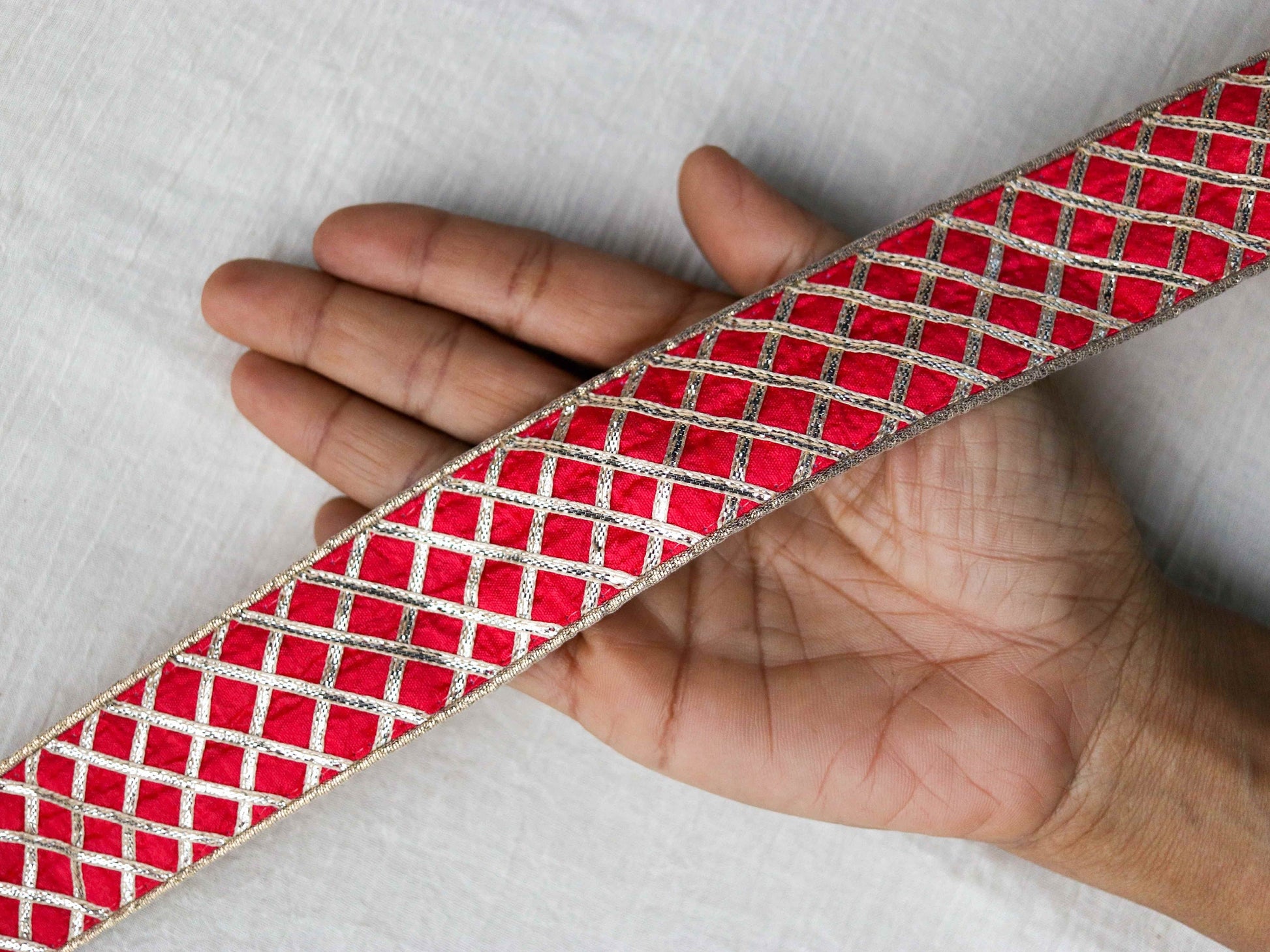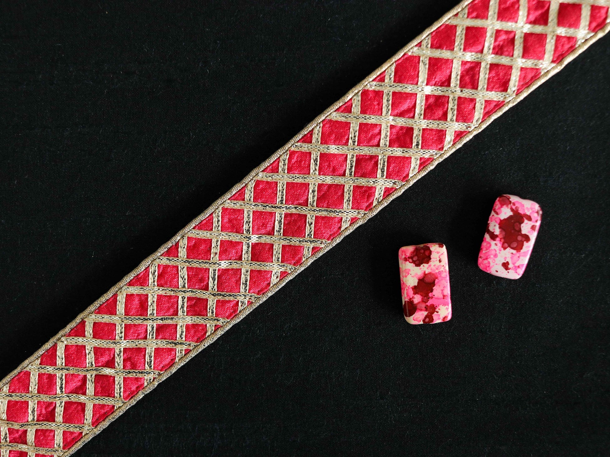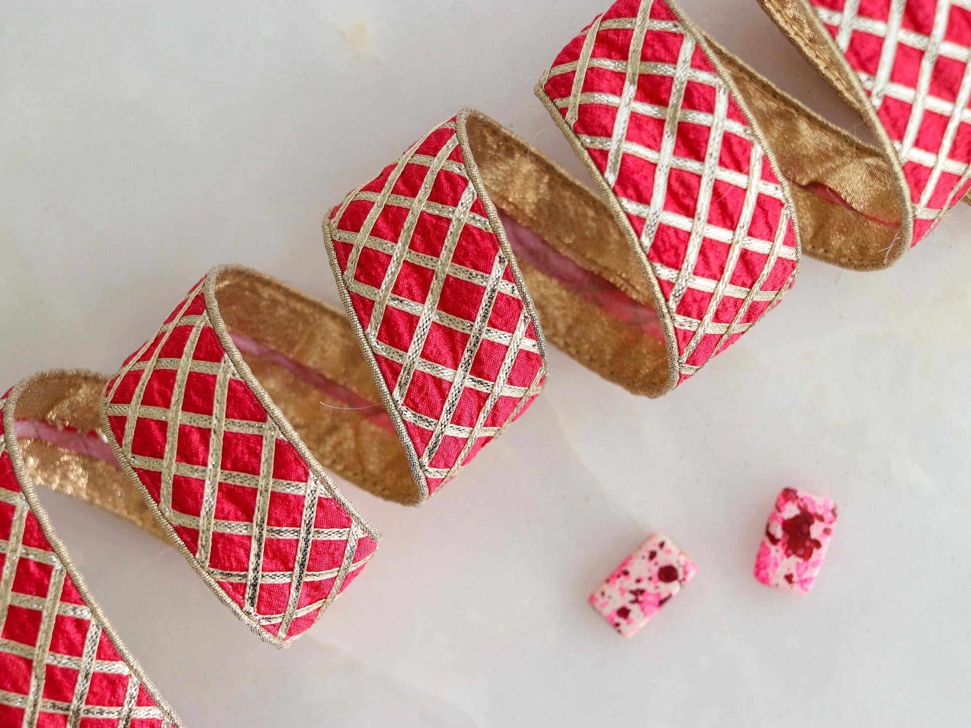 Created with gold foil, known as gota. With a checkered design created with cutwork, on a deep pink cotton silk base. Sure to make any outfit or project look very festive and glamorous.