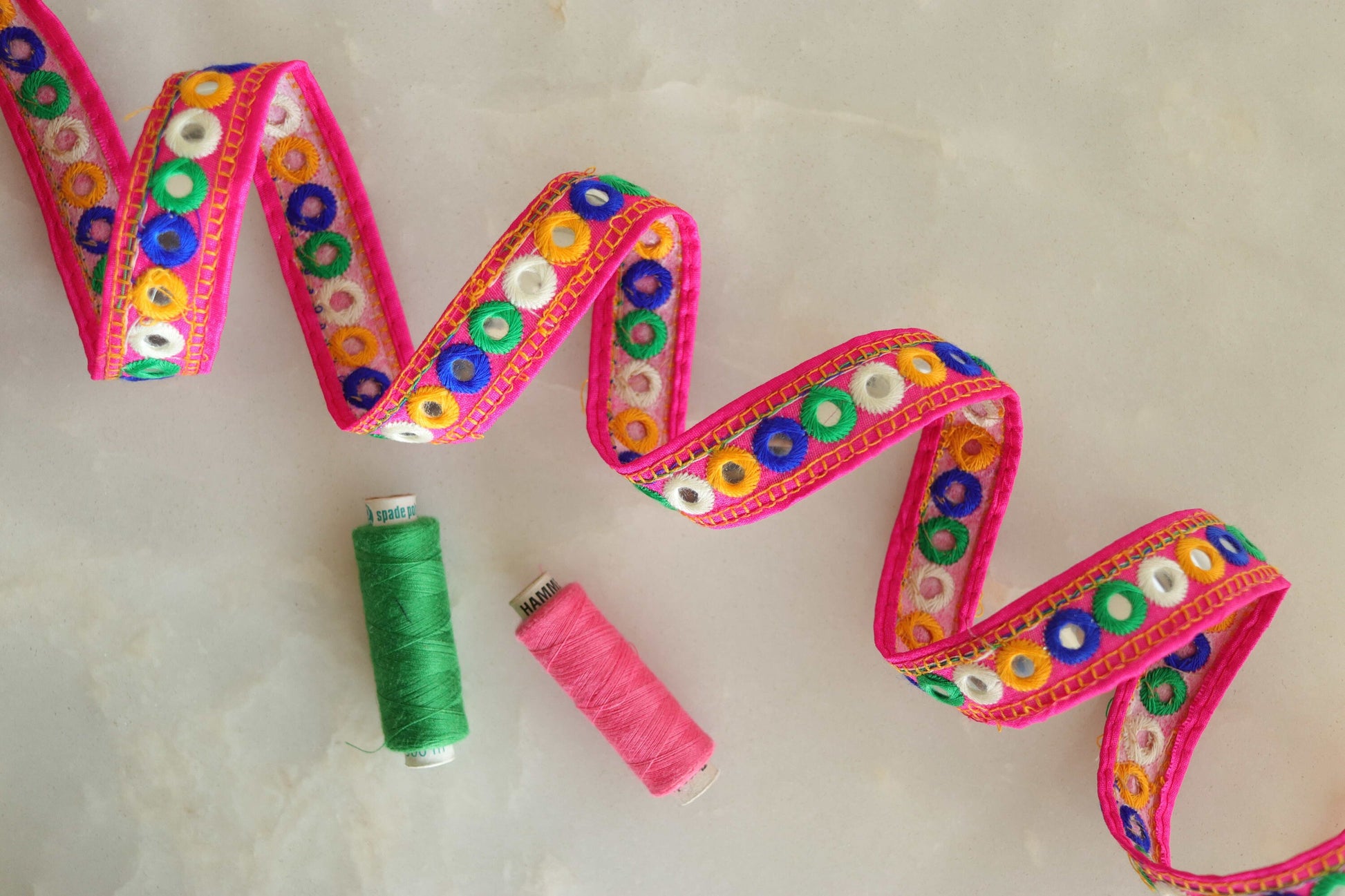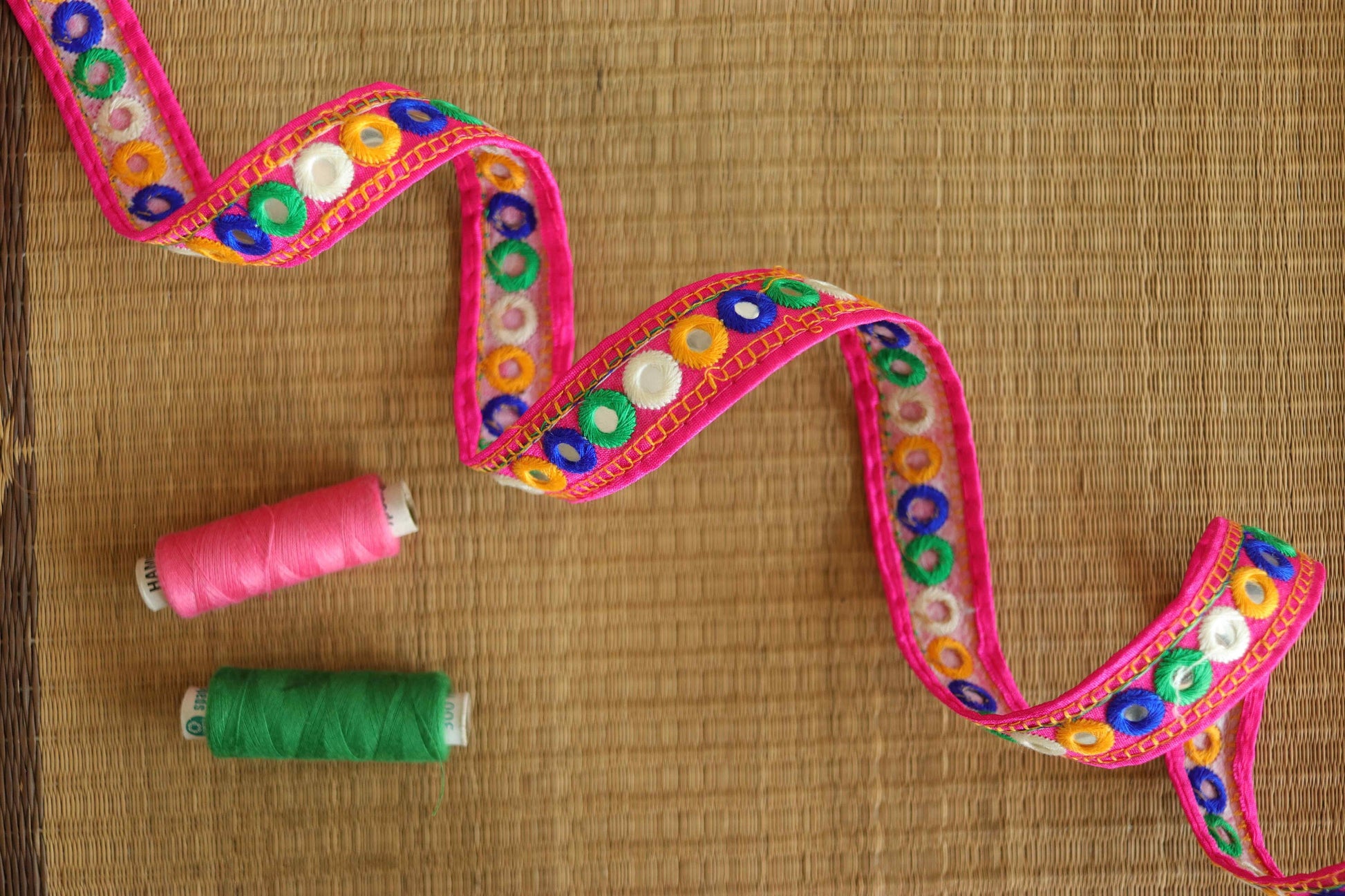 Pink Mirror Embroidered Kutchi Trim,Indian Embroidered Border,Pink Faux Mirror Lace,Tribal Boho Hippie Saree Border,Price/mtr