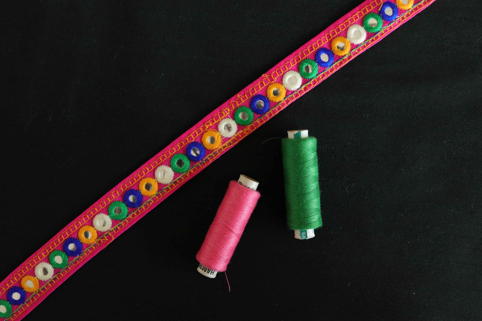 A beautiful trim with multicolour embroidery on a pretty pink fabric base. Made evermore cheerful with small faux mirror pieces