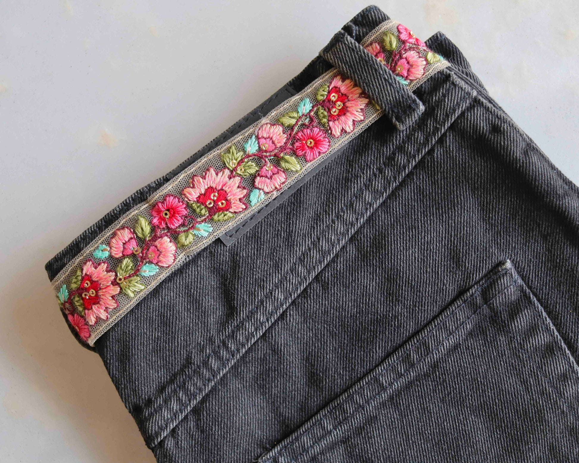 A pretty floral trim with peach and pink flowers on a net fabric. Delicately embroidered in the Parsi style of embroidery, characterised by floral patterns in dense stitches. A very elegant colour combination. Make it elegant or boho, style it your way.