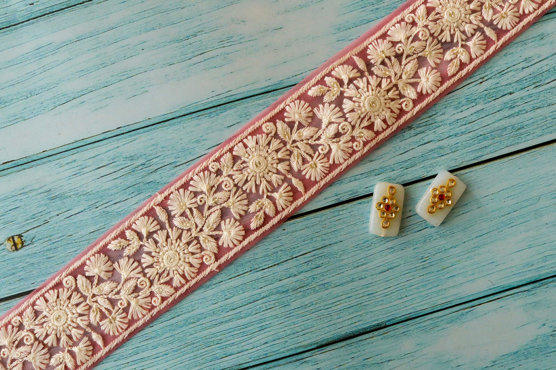 Pink White Floral Embroidered Trim,Indian Fabric Net Border,Lucknowi Chikankari Pink Lace,Pink Silver Saree Border,インド刺繍リボン,Price/mtr