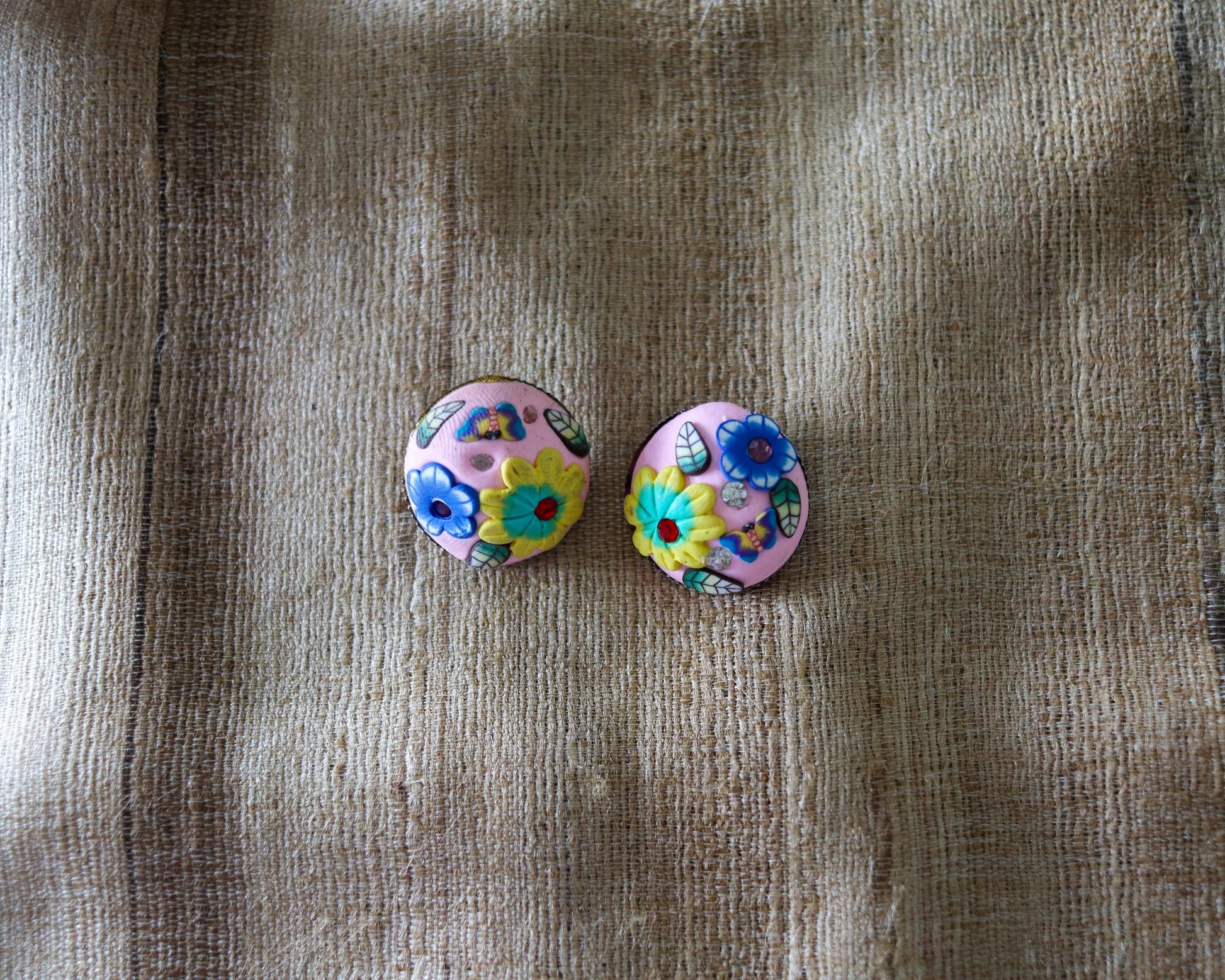 A pretty little button with small flowers created on it in yellow and blue, with a tiny butterfly dancing among them. Embellished with a couple of tiny diamantes for a bit of glam. The sculpted flowers give the button a unique 3-D look.
