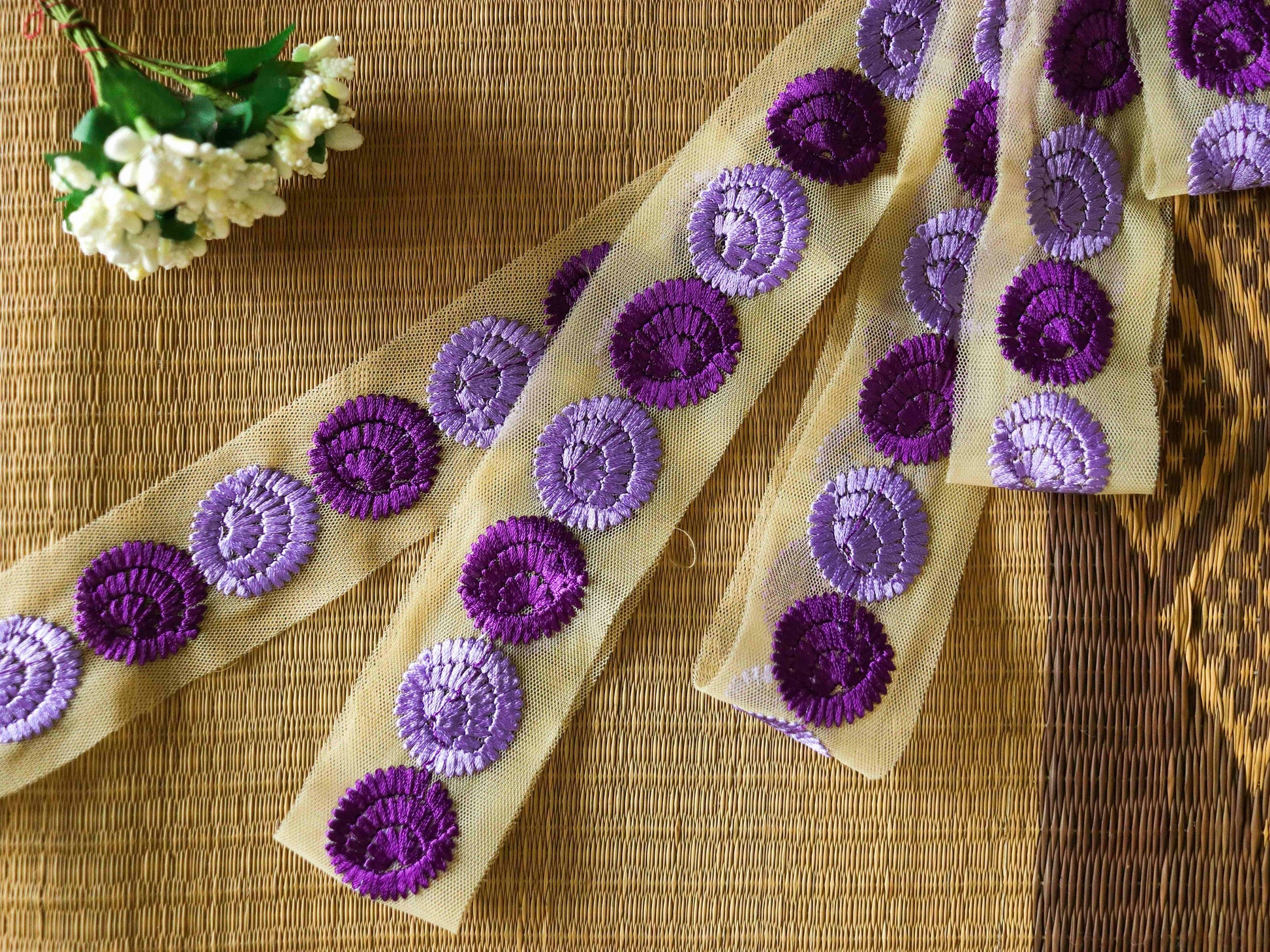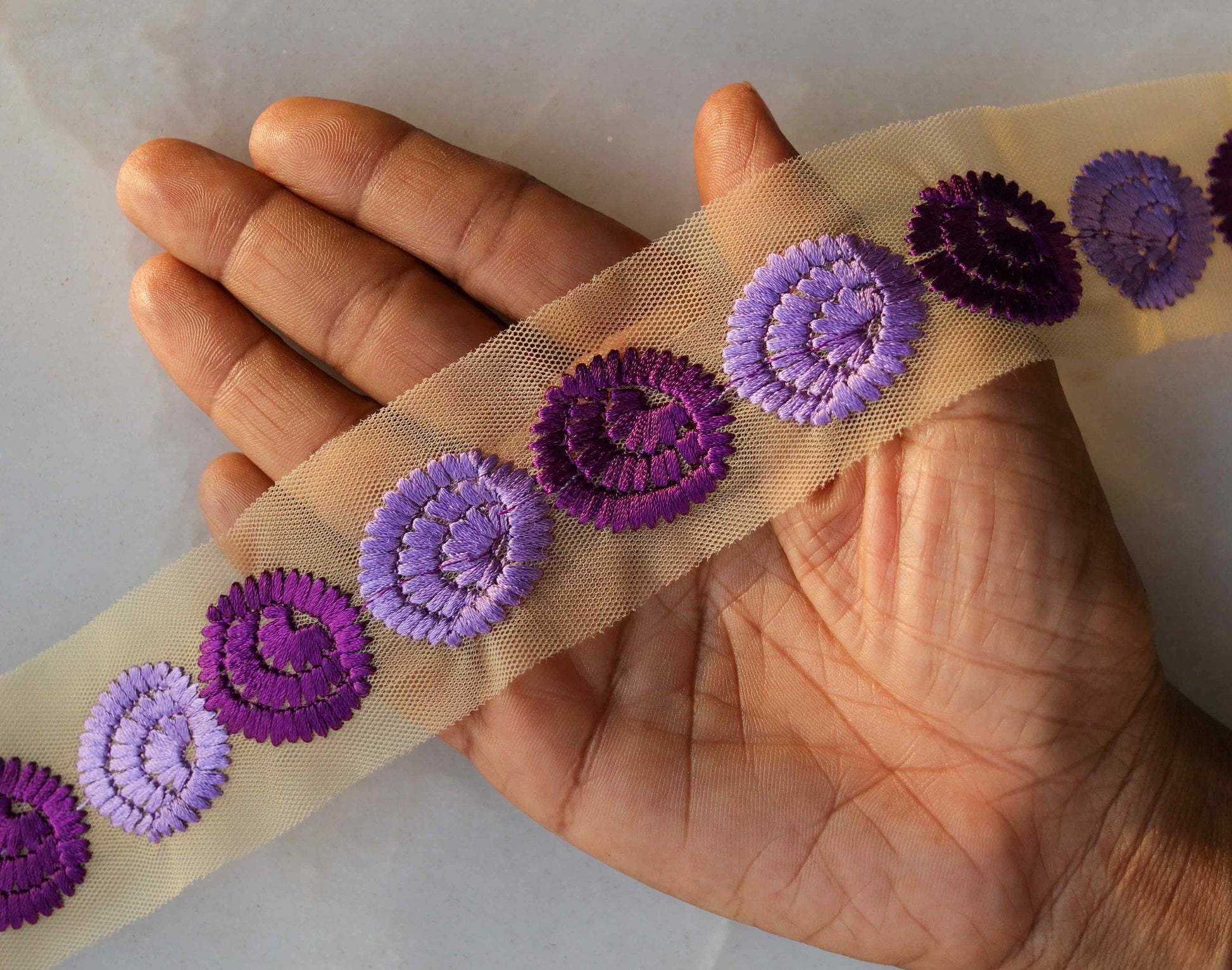 With a delicate floral pattern embroidered in light and dark purple. On a light beige net. As soft and light as a feather. For the right touch of elegance to any project.