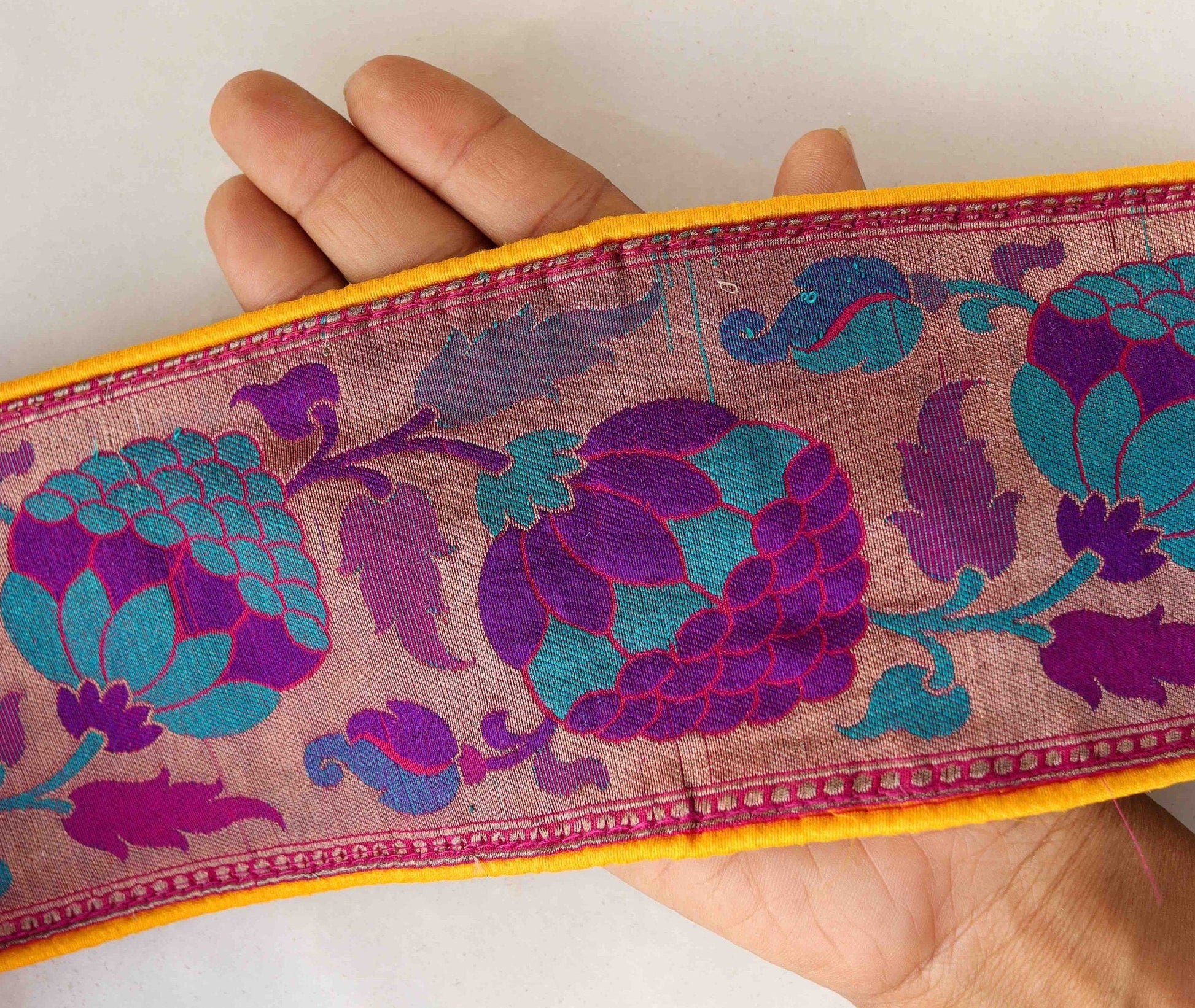 This gorgeous trim is created with Banarasi brocade weave, with unique floral motifs. Woven in purple and teal silk threads on to a soft silk fabric with a gold weave. Finished with a bright yellow piping along both edges to give a beautiful contrast. The colour combination and muted gold give a very vintage and royal look to the trim. And to any project you use it on.