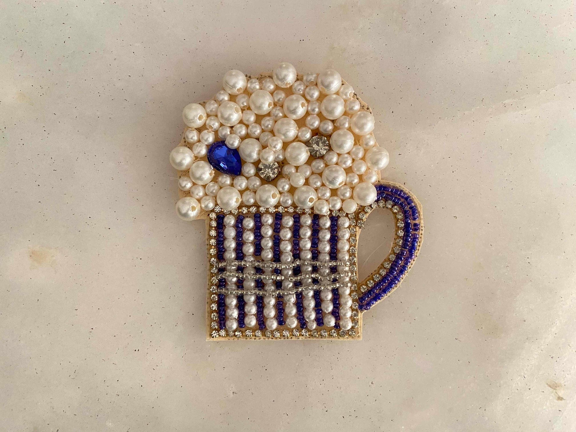 A quirky, playful patch in the shape of a beer glass. Handmade with beads in blue and white. With white beads in different sizes making up the beer froth. And embellished with diamantes big and small. A patch to add a dose of fun to your jacket, or pocket, or bag!