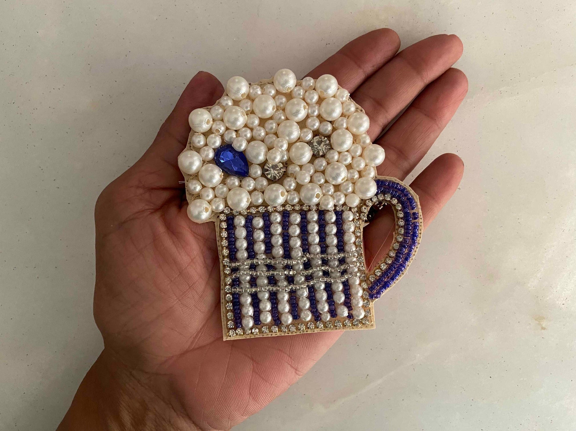 Quirky Beer Mug Beaded Patch,Handmade Embroidered applique, Blue White Drink Patch,Food Applique, Boho Playful applique