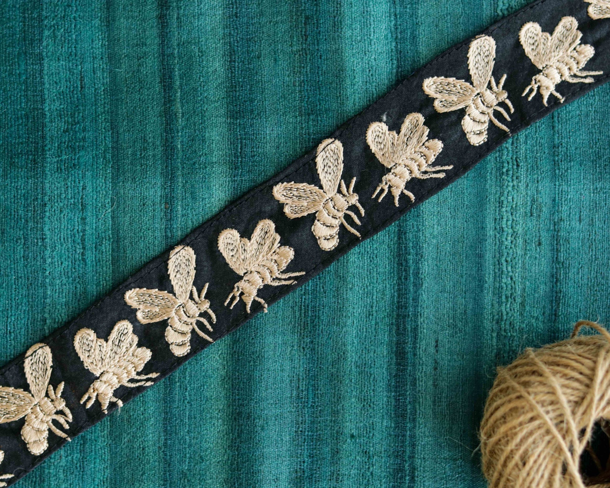 A row of honeybees, embroidered in beige on a black cotton base.