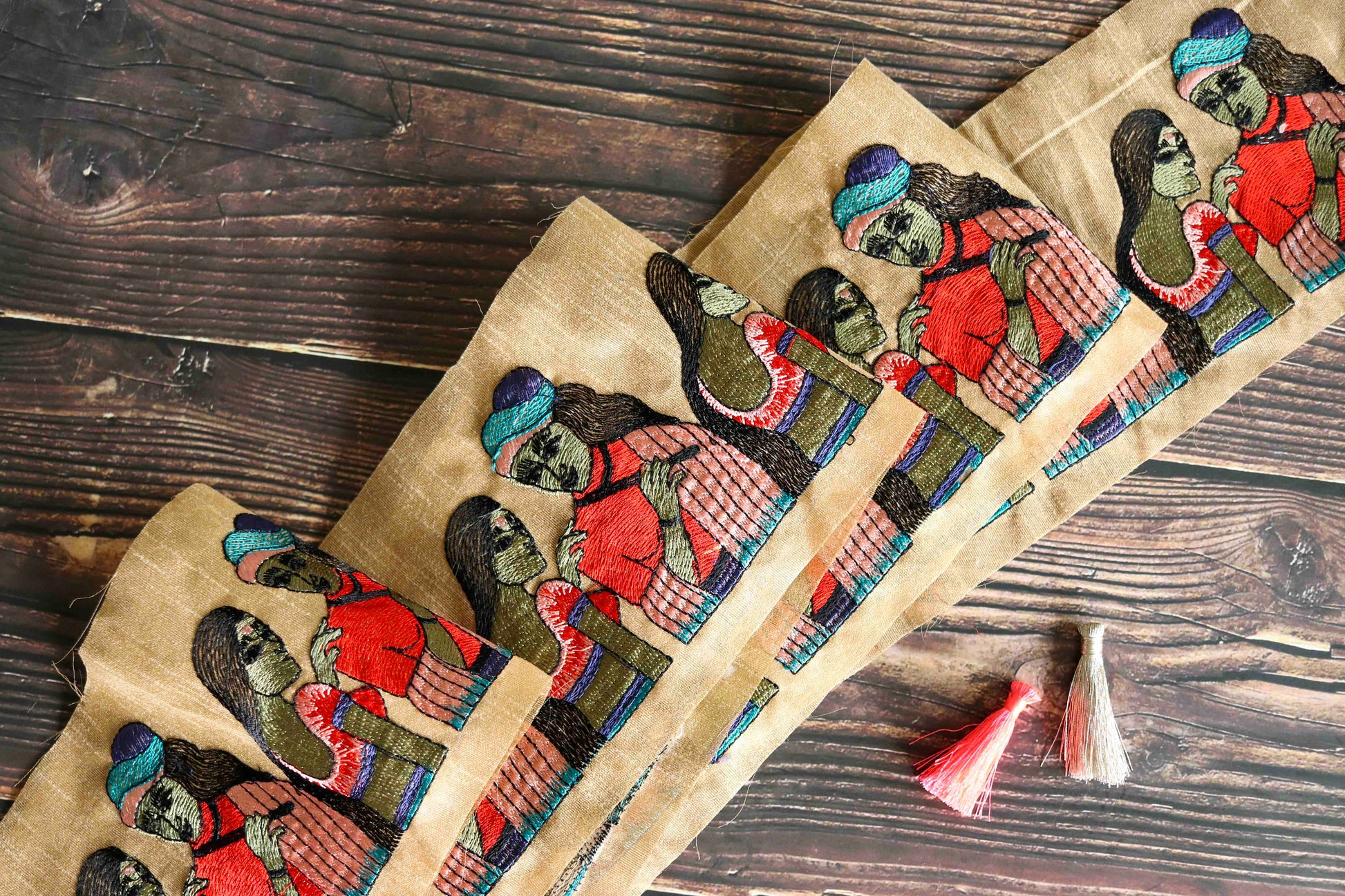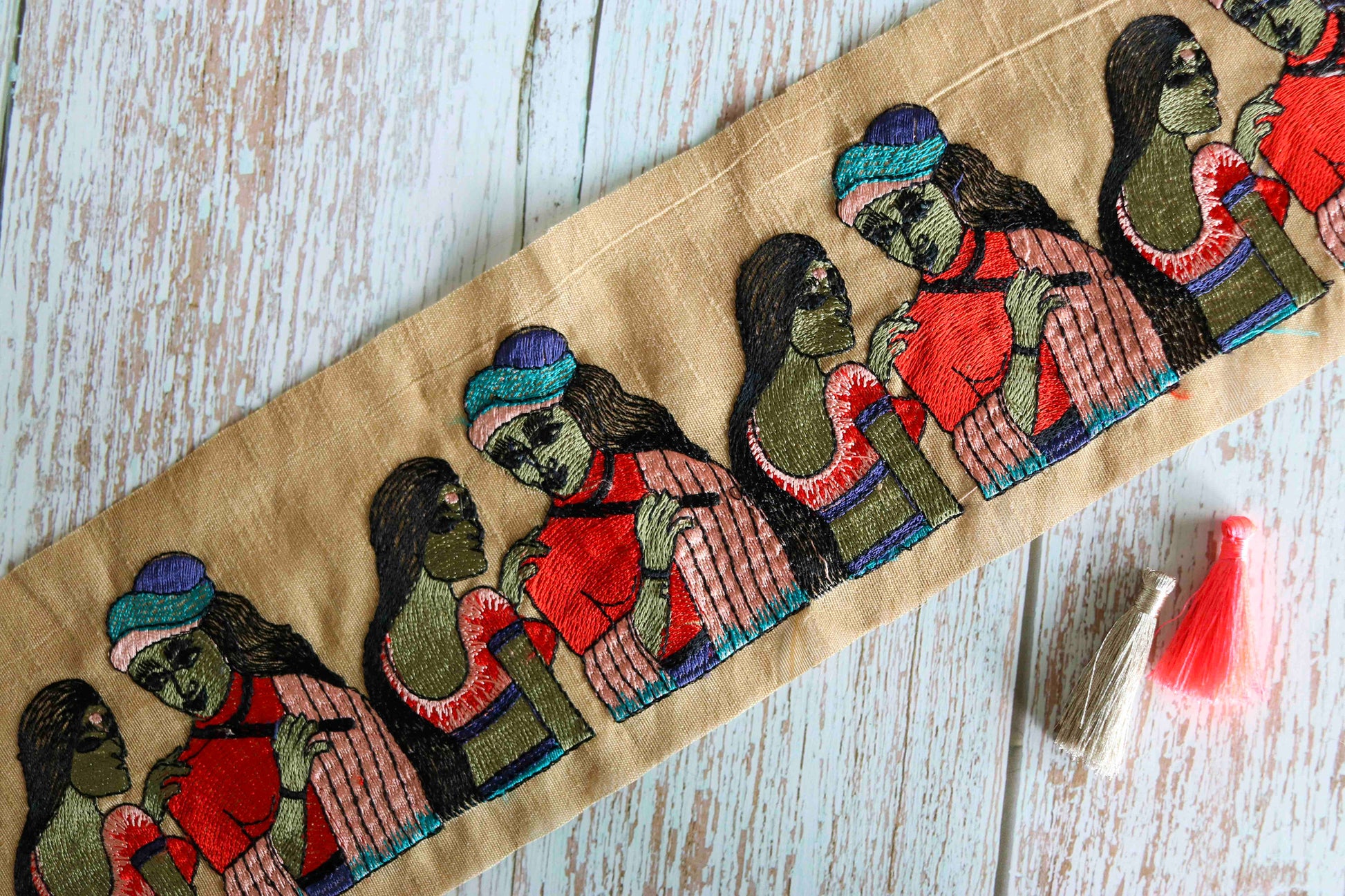 This quirky trim depicts a man and a woman, created with intricate embroidery on a beige cotton silk fabric. Each of their features brought out delicately, with different colour threads. With such precision that it looks like a painting.