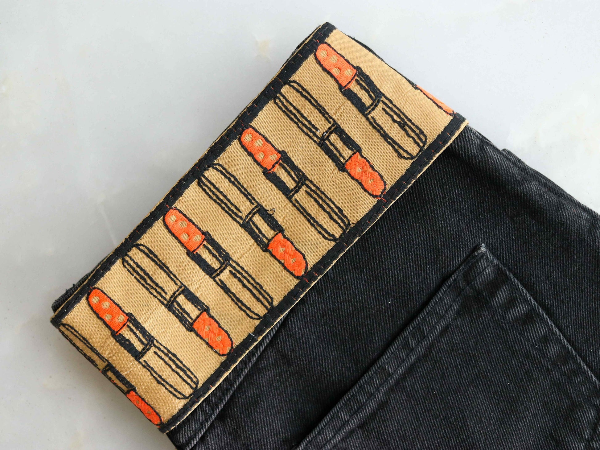 A very quirky, playful trim with a row of lipsticks in bright orange. Created with embroidery on a beige cotton fabric base. Inspired by popular Indian designers who play with fun, quirky everyday objects in their costumes.