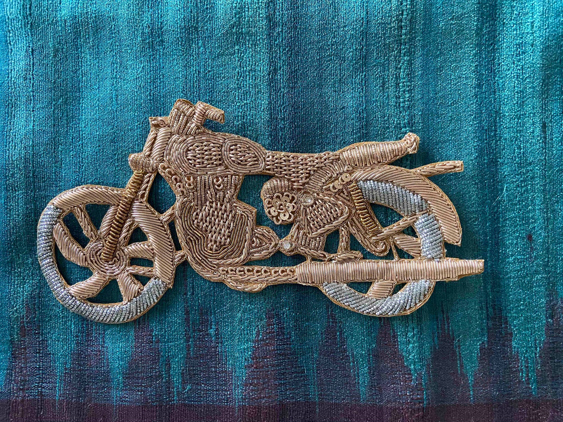 A very quirky patch, created in the shape of a gorgeous motorcycle. Handmade with zari embroidery in shades of old gold and grey. With each element of the bike detailed out meticulously. Take it out for a spin today!