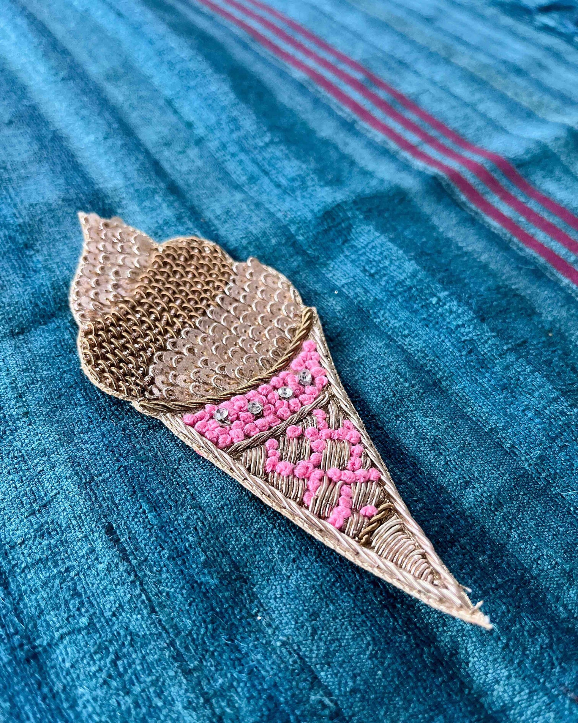 A quirky, playful patch in the shape of an ice-cream cone. Created with many small sequins in light gold and embroidery in gold zari. With a dash of colour created with small french knots in pink. A dessert to add a dose of fun to your jacket, or pocket, or bag!
