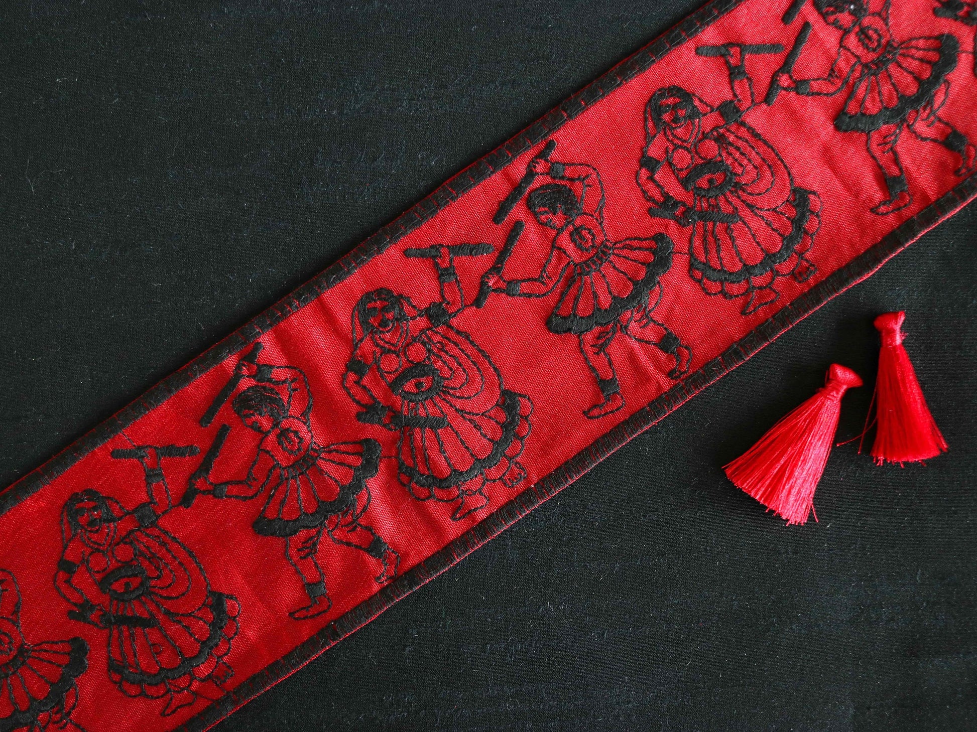 Dandiya and Garba are traditional dance forms, that Indians dance to during the 9 night long festival of Navratri. During these nights, they dress up in their festive best, with women wearing ghagras and the men wearing kedias, and go dancing to folk music. This fun, quirky trim captures that scene with embroidery in black on red cotton. Depicting the guys and girls the guys dressed in their festive best, merrily doing the dandiya. A boho, festive trim, sure to add a lot of drama to any project!