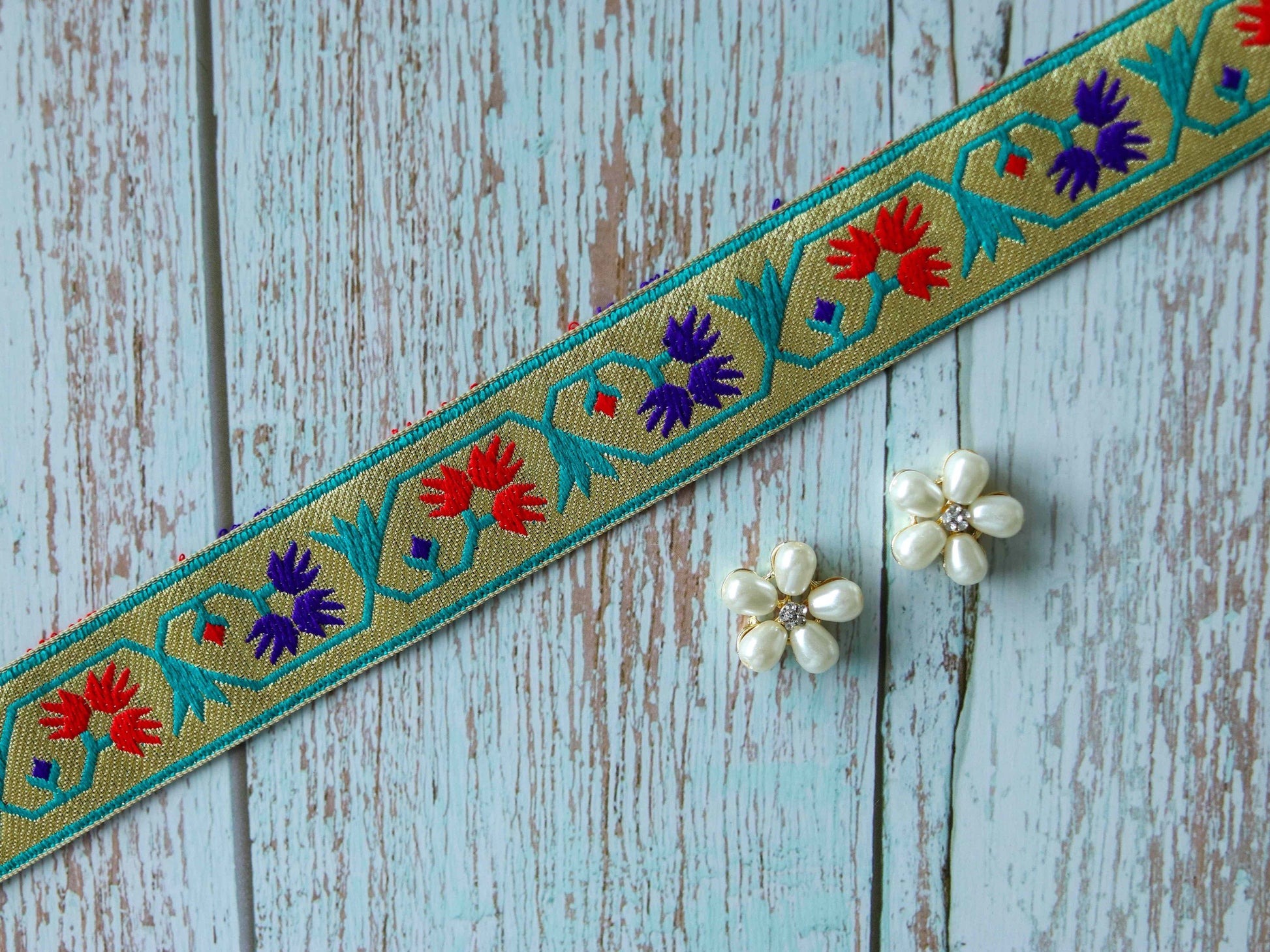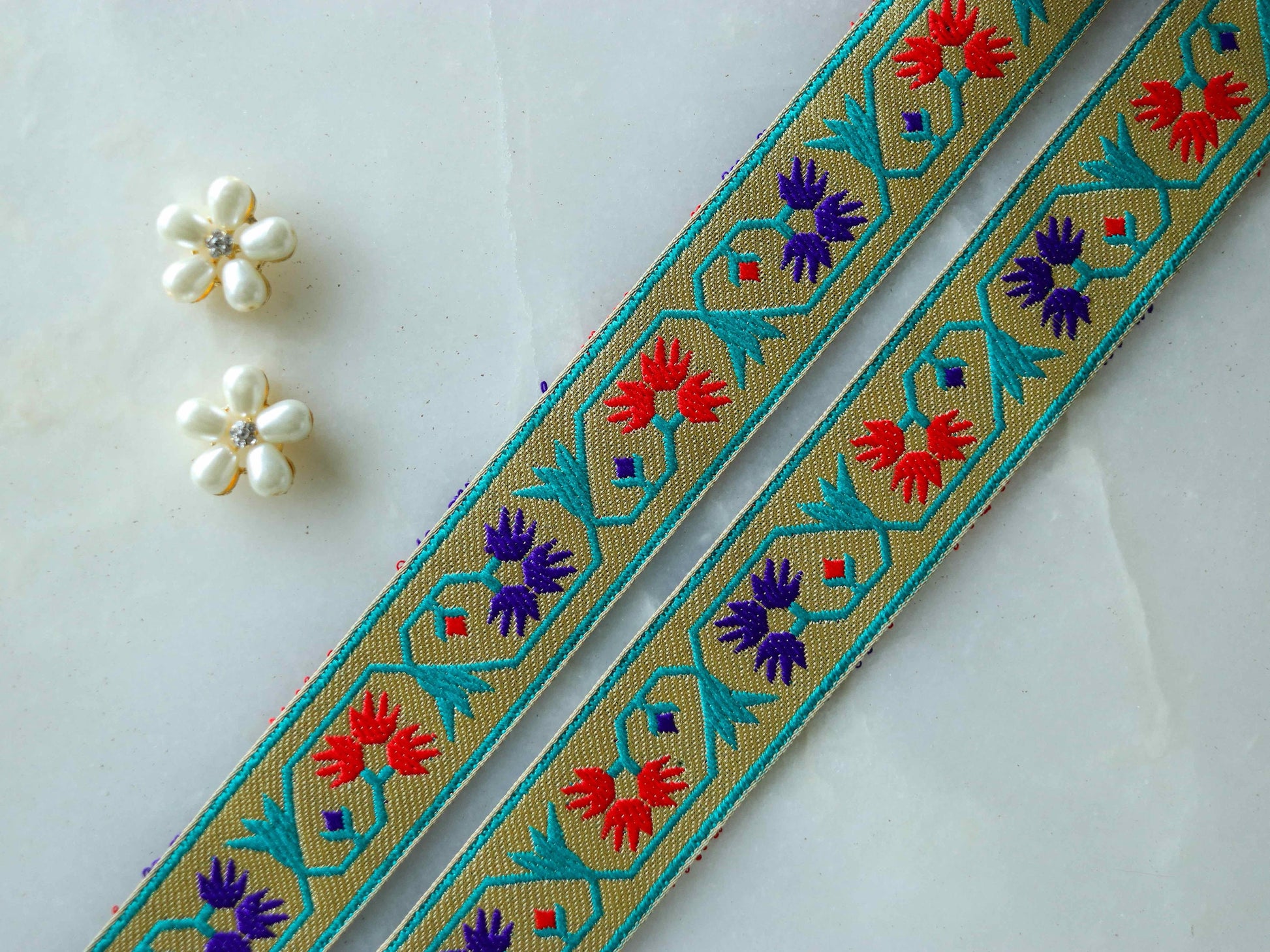 This gorgeous trim is created with brocade weave, with a dainty floral motif. Woven in red, blue and gold silk threads. The colour combination and muted gold give a very regal look to the trim. And to any project you use it on.