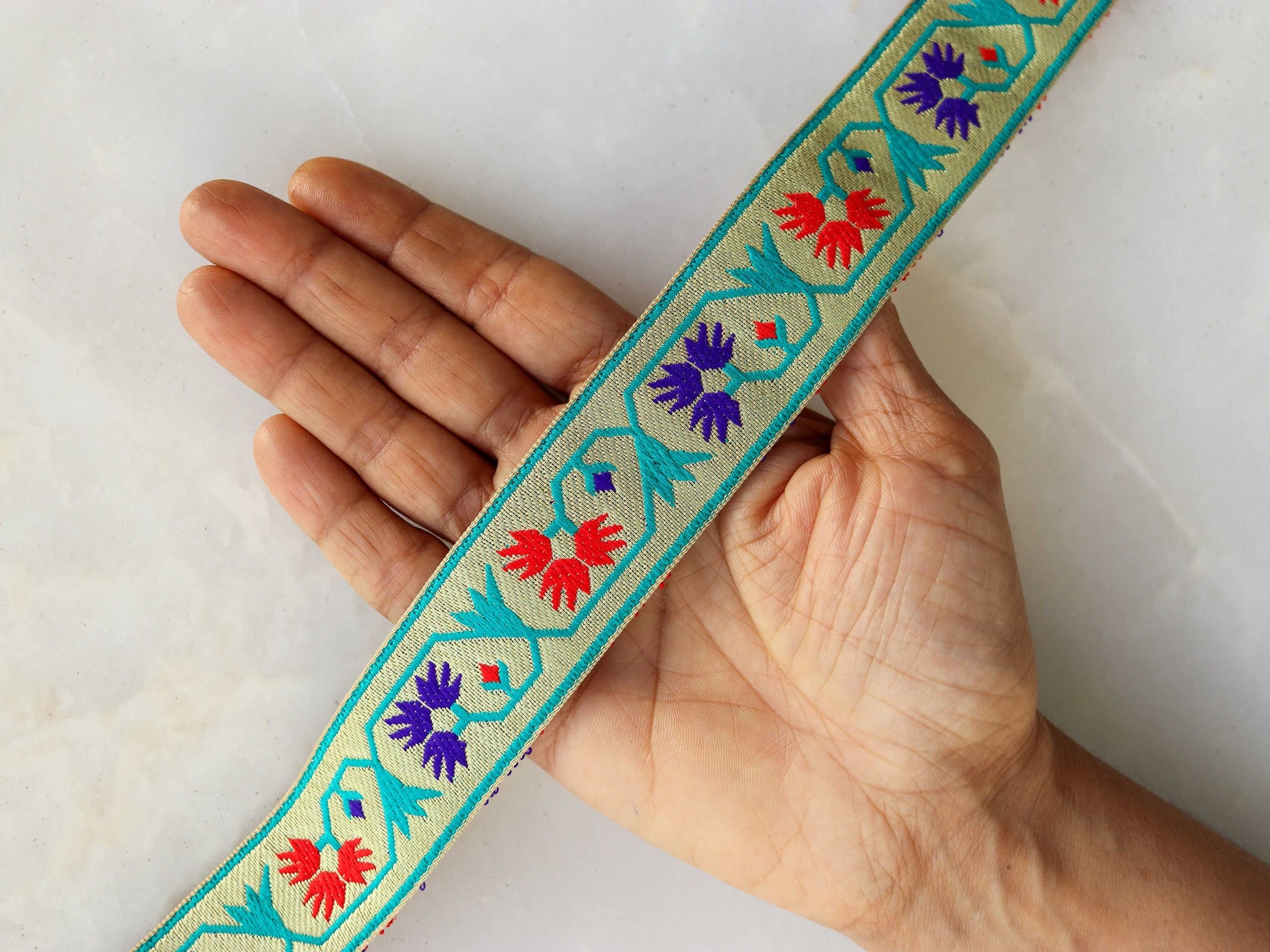 Red Blue Floral Banarasi Trim,Brocade Border,Indian Brocade Lace,Banarasi Saree Border,Golden Bridal Trim,Price/mtr