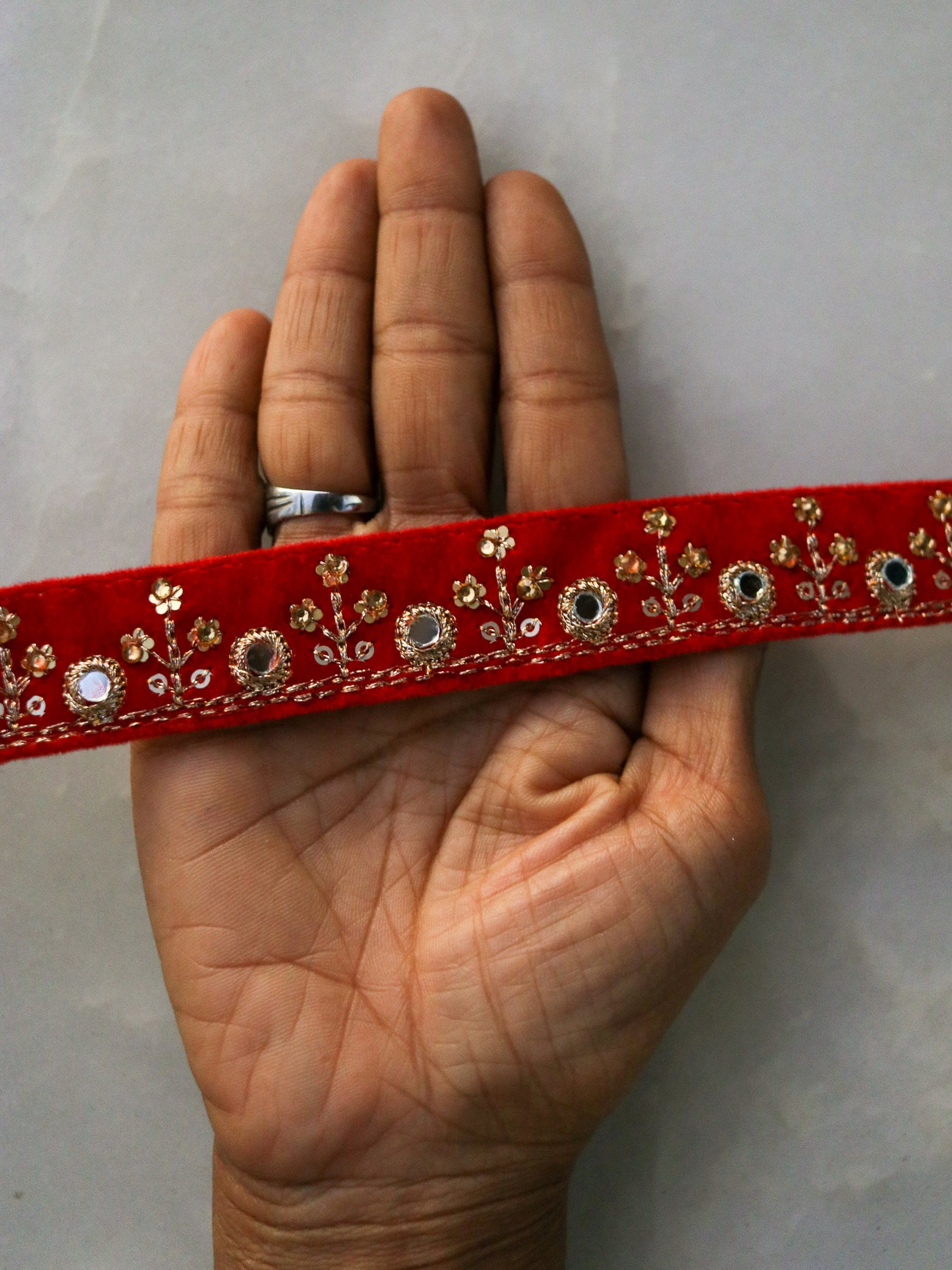 Red Gold Mirror Sequin Trim,Indian Embroidered Border,Red Gold Velvet Floral Lace,Red Velvet Saree Border,Red Mirror Sequin Border,Price/mtr