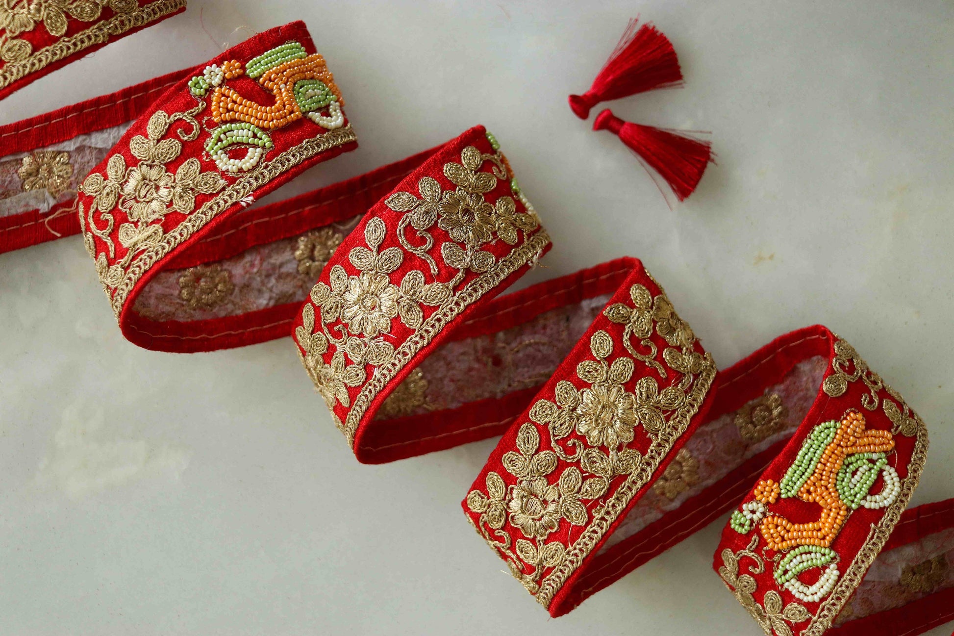 Red Gold Scooter Embroidered Trim,Quirky Orange Scooter Border,Vehicle Embroidery Lace,Indian Trim,Boho Red Gold Saree Border,Price/mtr