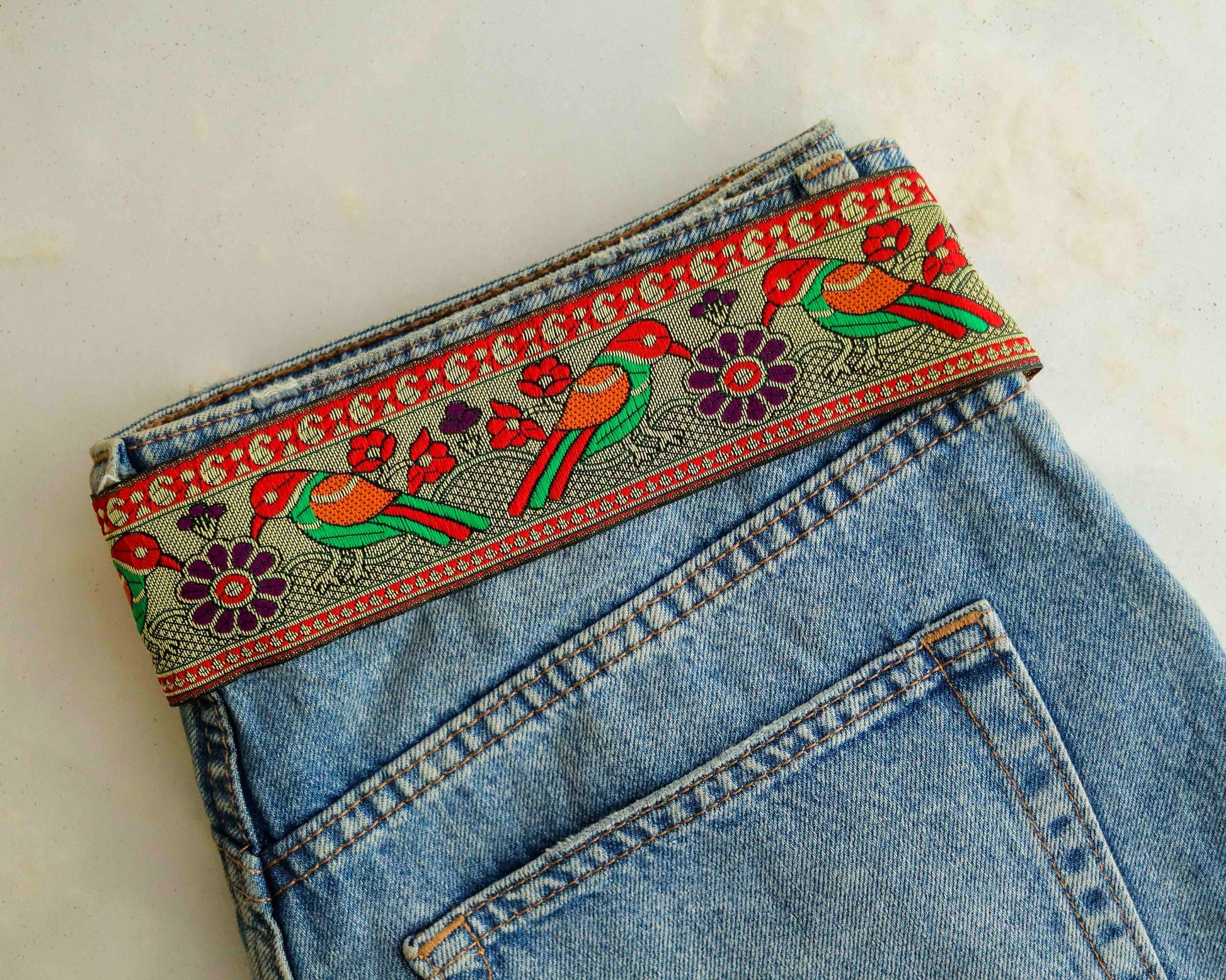 This boho trim is created with a brocade weave, with pretty exotic birds woven in red, green and gold. In a Banarasi style. The colour combination and design give a very vintage and boho look to the trim. And to any project you use it on.