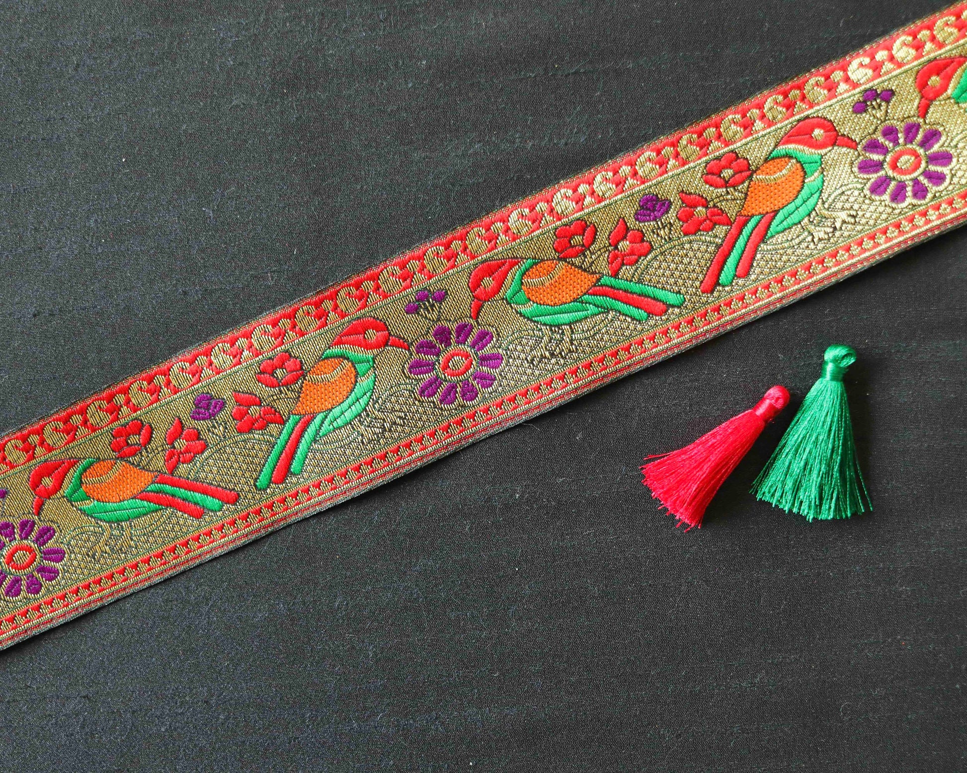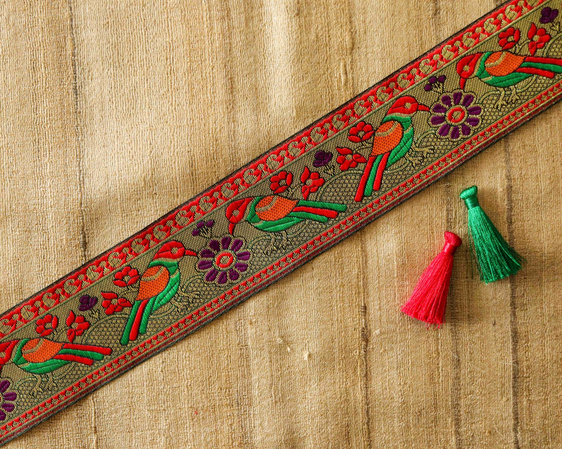 Red Green Parrot Jacquard Trim, Brocade Banarasi Bird Floral Border, Indian Brocade Lace, Boho Trim, Floral Saree Border