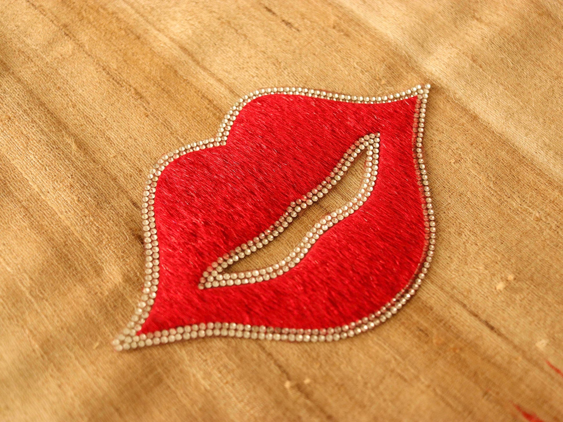 A veyr quirky patch in the shape of a pair of red lips, created with soft red velvet / felt type strands. Lined with tiny diamantes to add a touch of glamour. With a heat transfer vinyl (HTV) backing. So it can be ironed on easily onto any fabric. A kiss that's sure to add oomph to any project!