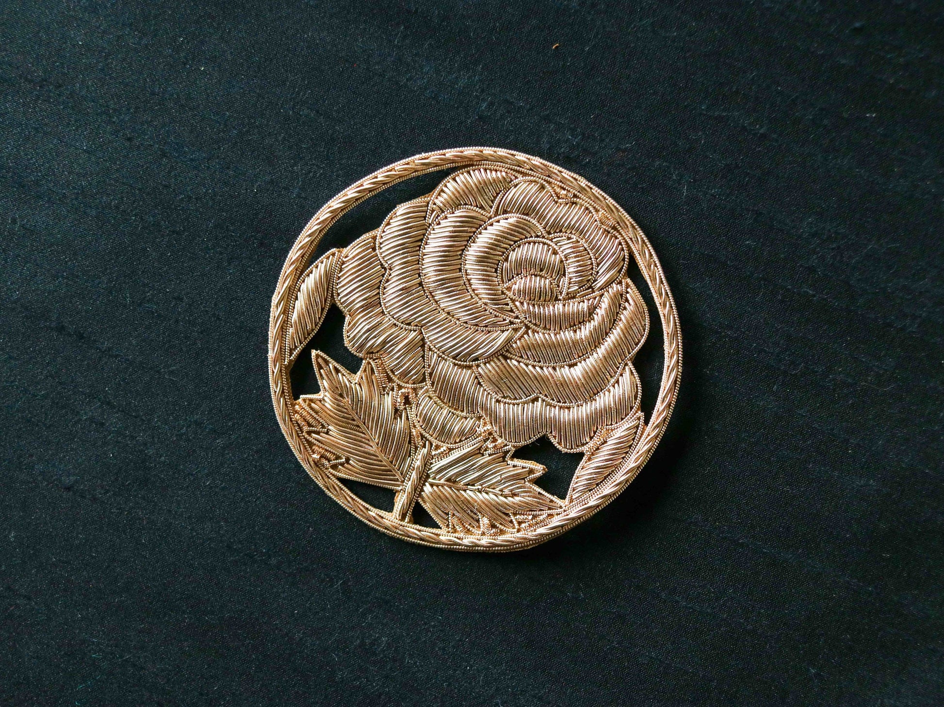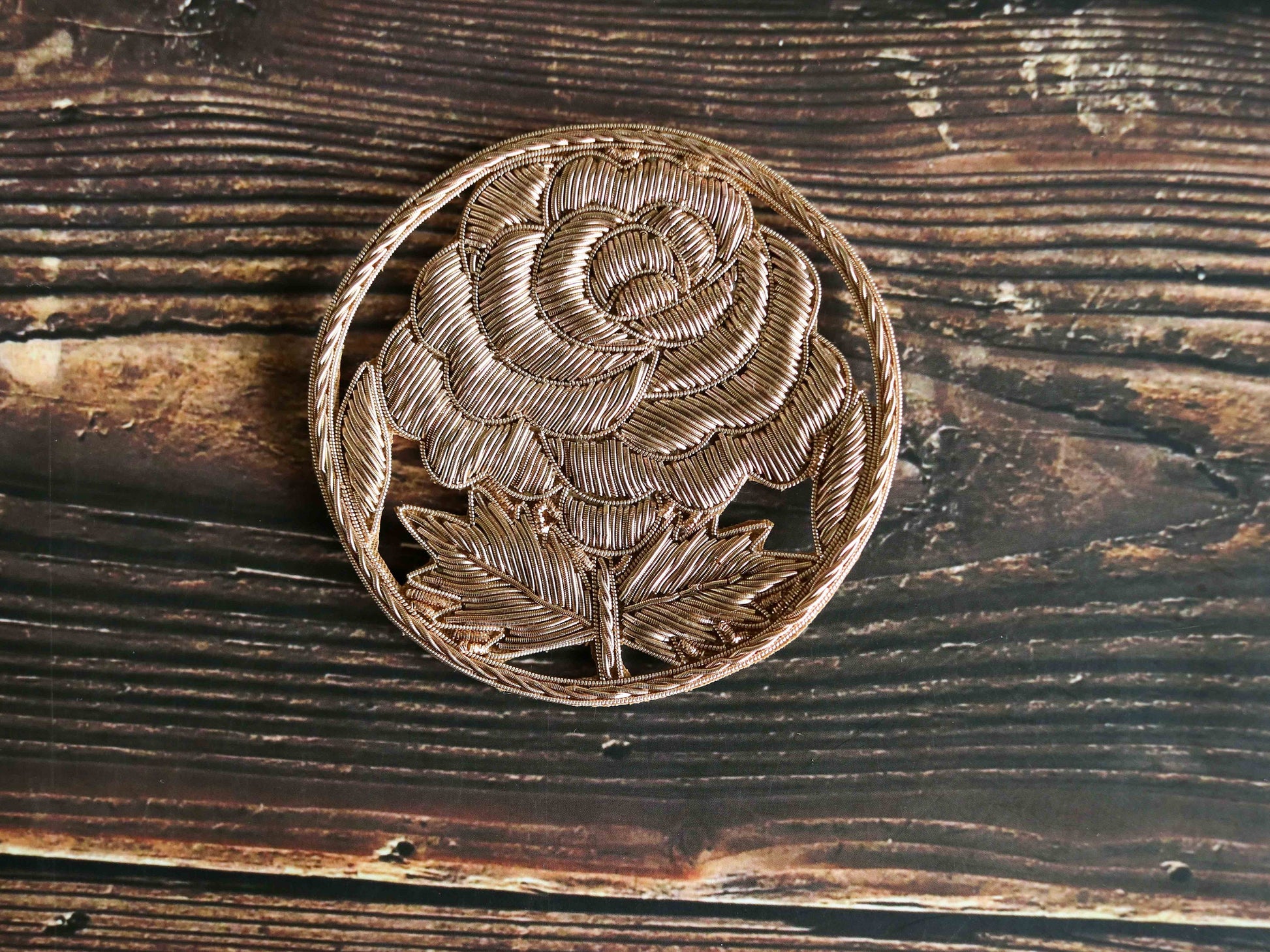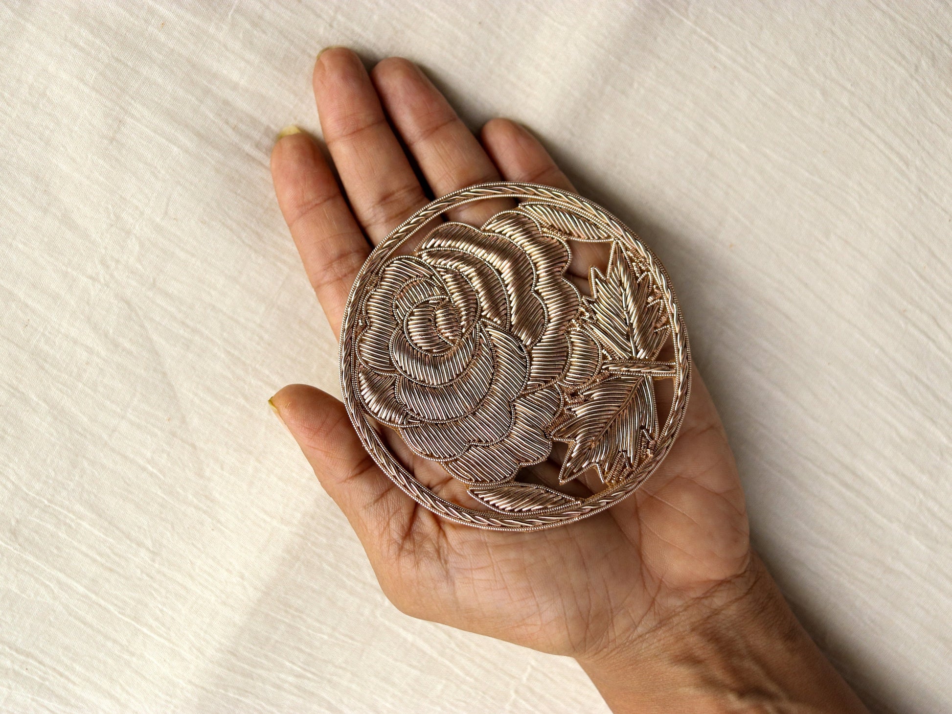An elegant patch in the shape of a rose, created with zari and zardozi (golden wire thread) in rose gold. And cutwork that gives it a very unique look, like its embroidered directly onto your fabric. A perfect patch to add grace and glamour to any project.