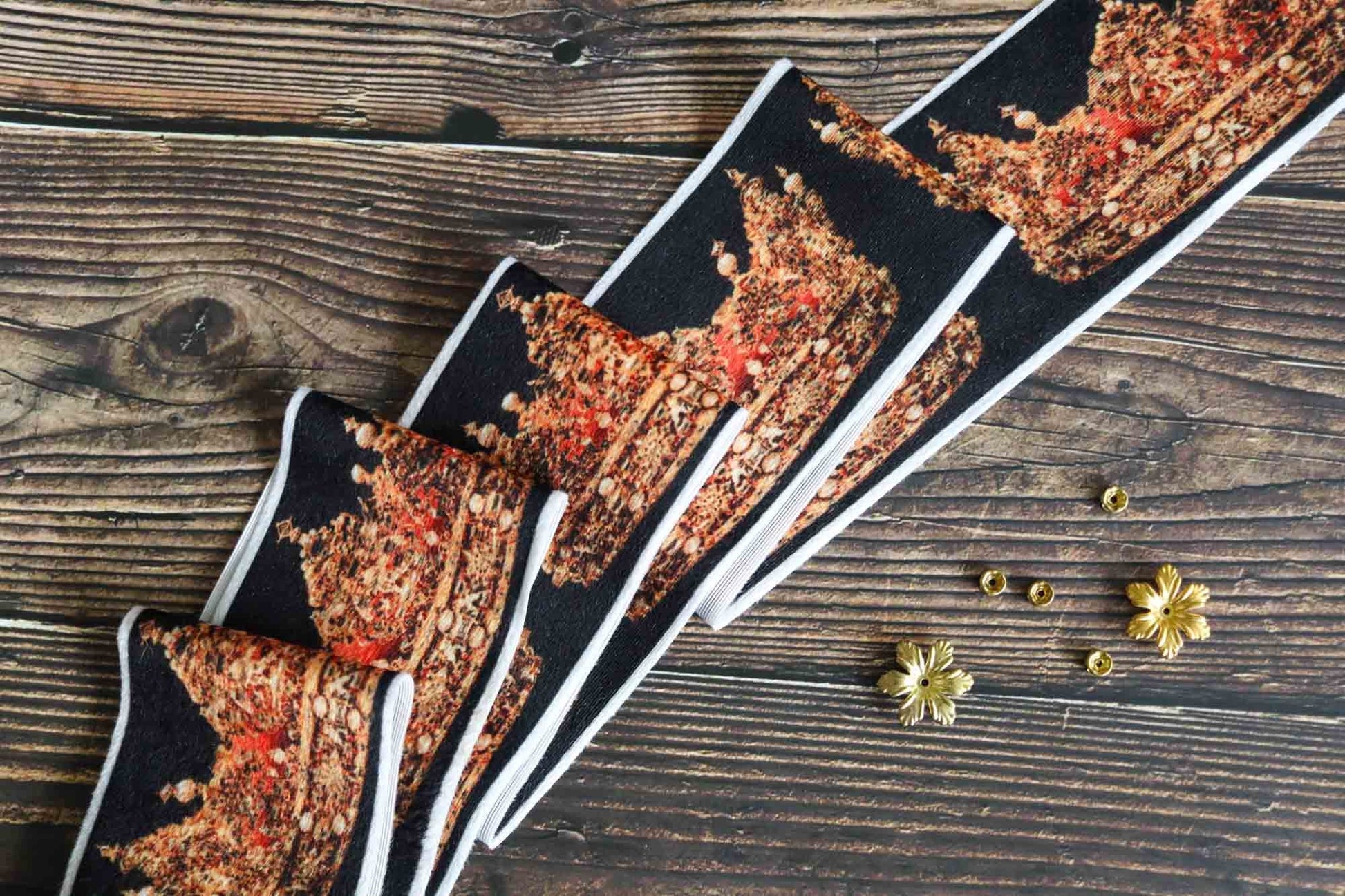 This quirky trim showcases a beautiful crown fit for royalty, created with a digital print in warm colours on a soft satin finish black fabric. Looks like part of a vintage painting. Very soft feel and drape.