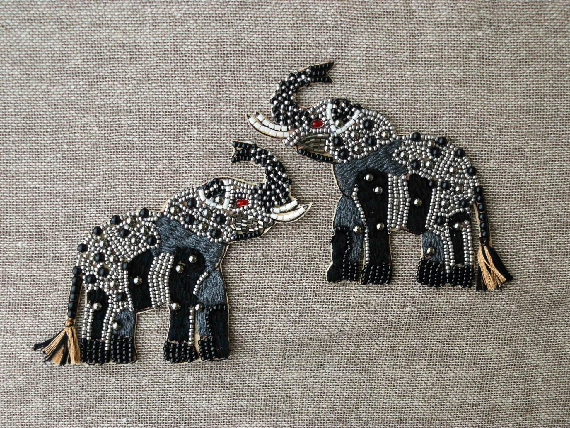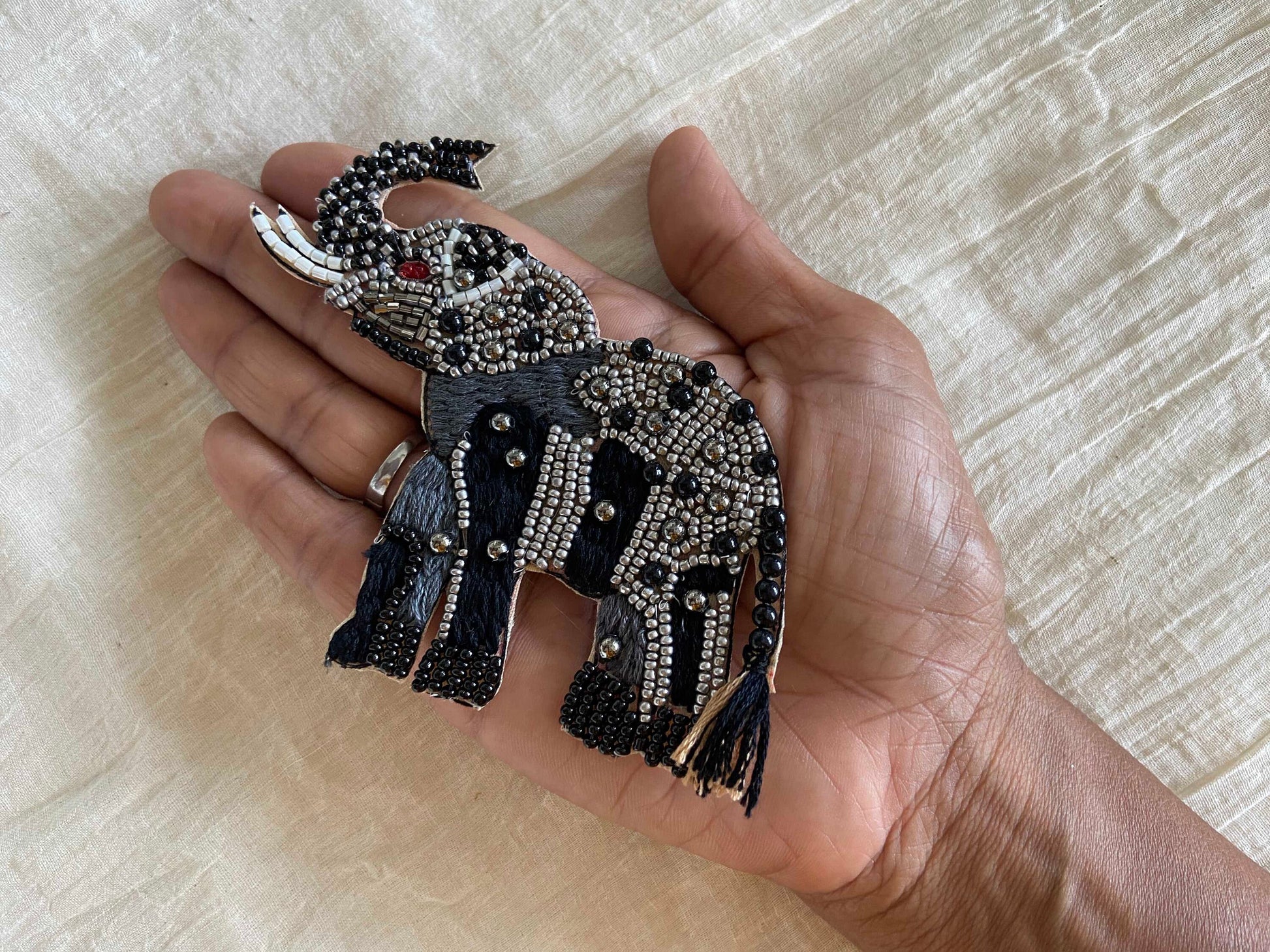 A gorgeous patch, handmade with beads of different shapes, in silver and black. With each detail of the elephant created with different elements, including white beads for the tusks.
