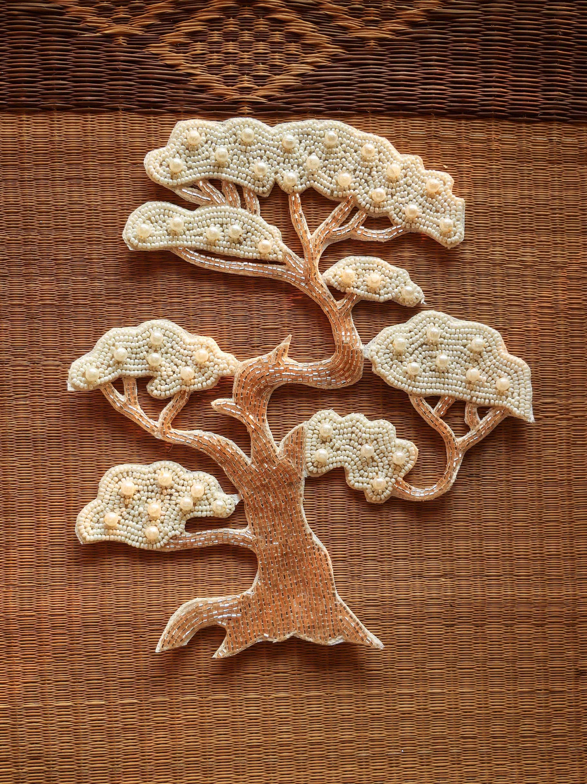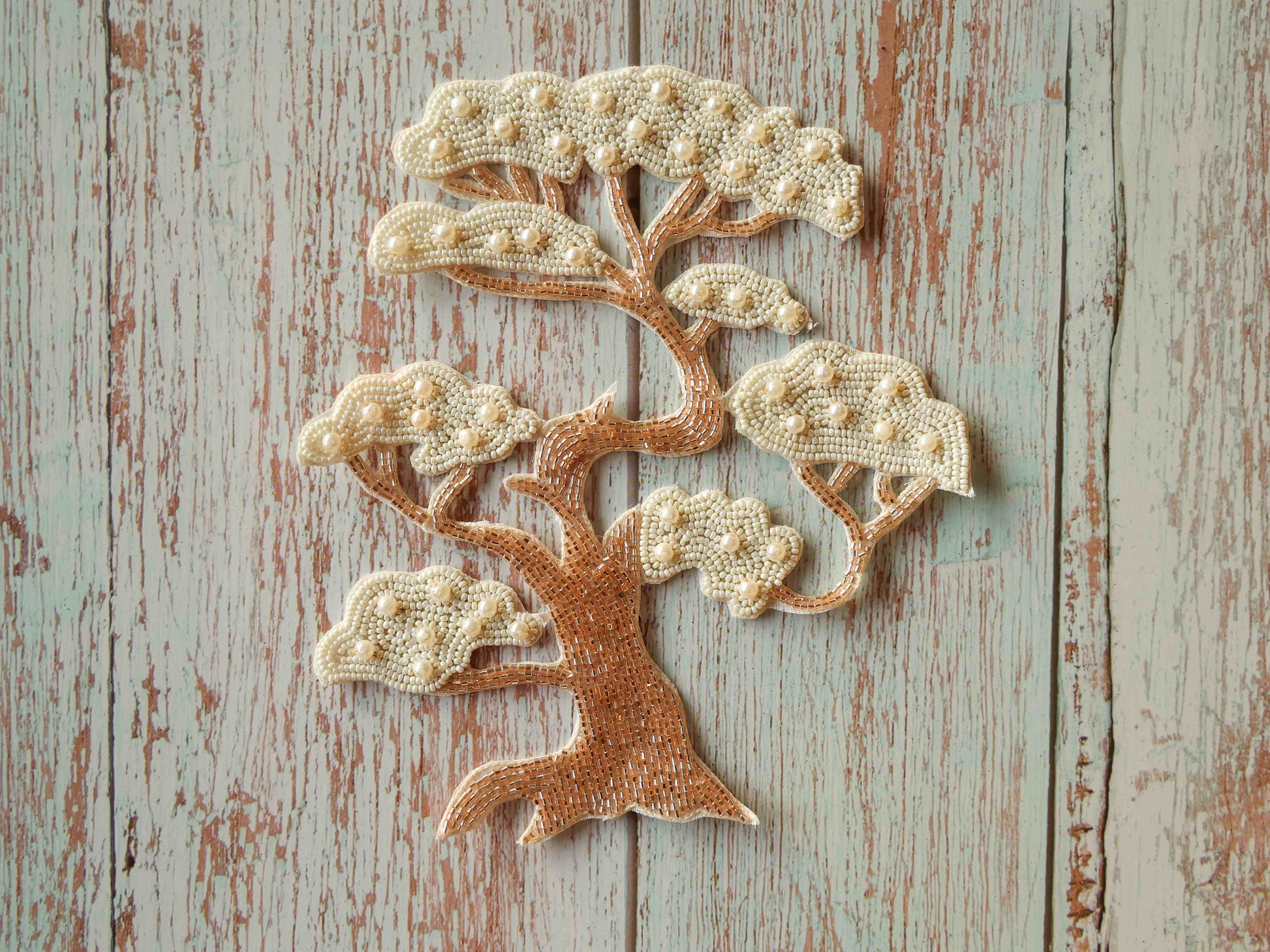 A large, quirky patch handmade with golden and white beads. With faux pearls as little fruits on the big tree. Created with intricate cutwork embroidery that will make it seem like embroidery done directly on your fabric.